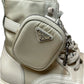 Detalhes: Coturno Prada confeccionado em couro e tecido e couro na cor bege. Modelo possui detalhe de tira posterior, bico arredondado e solado chunky de borracha. Contém bolso lateral removível com fivela e fechamento frontal por amarração.
