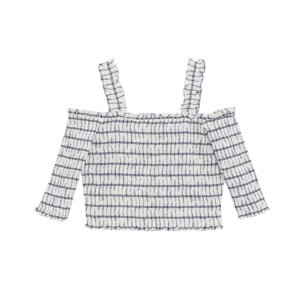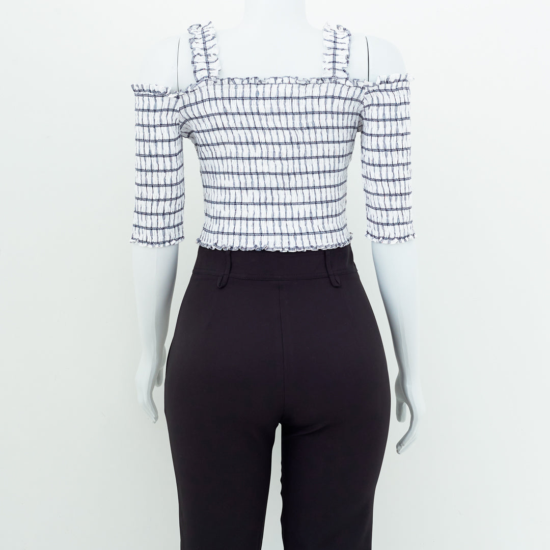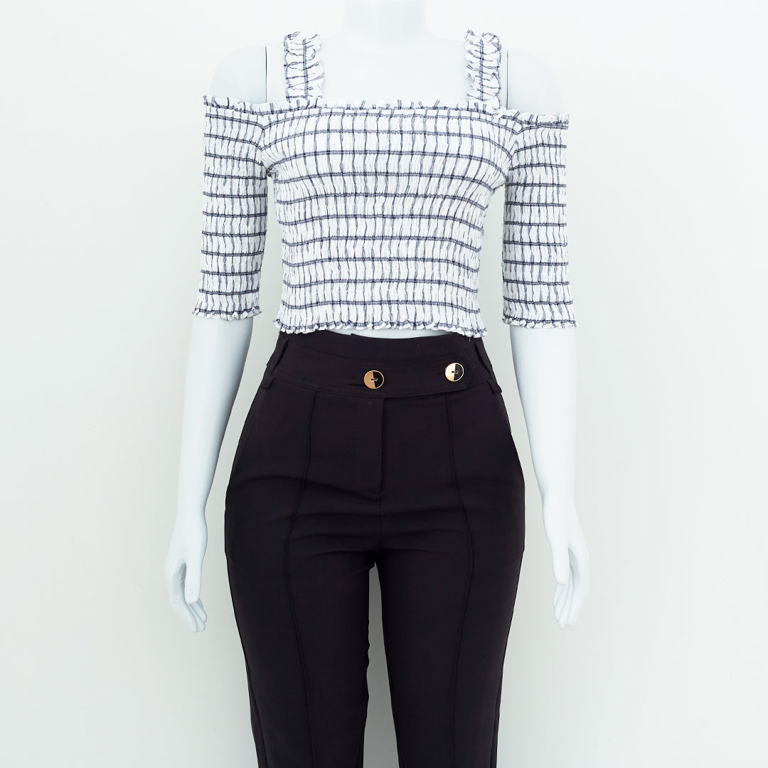 Detalhes: Cropped Framed xadrez confeccionado em algodão nas cores branca e azul-marinho com elástico. Possui decote reto ombro a ombro, mangas curtas e alças aplicadas.