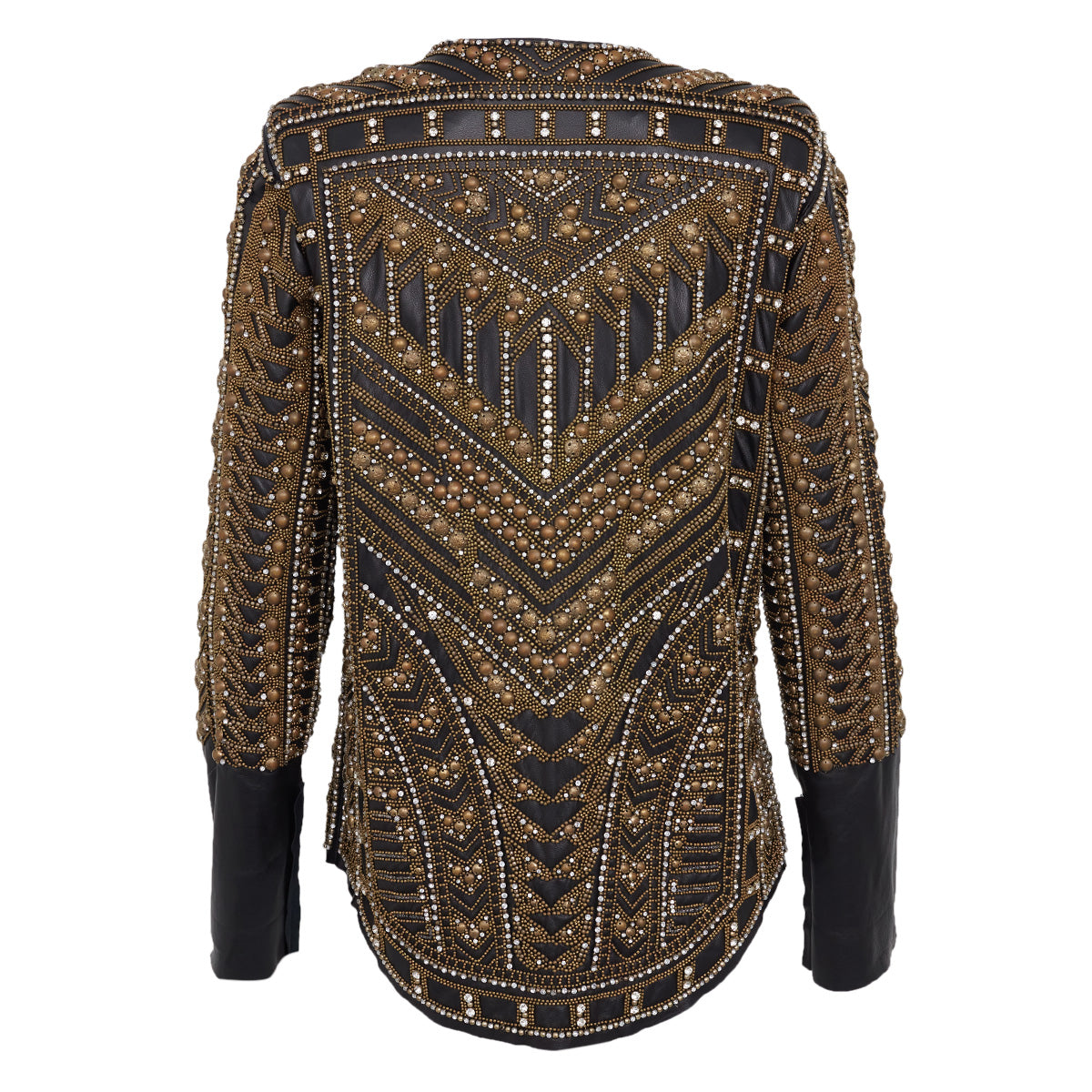 Detalhes: Jaqueta Balmain confeccionada em couro de cordeiro na cor preta bordado com miçangas douradas e strass. Modelo conta com modelagem alongada, mangas longas e gola reta,. Fechamento frontal por botões de pressão.