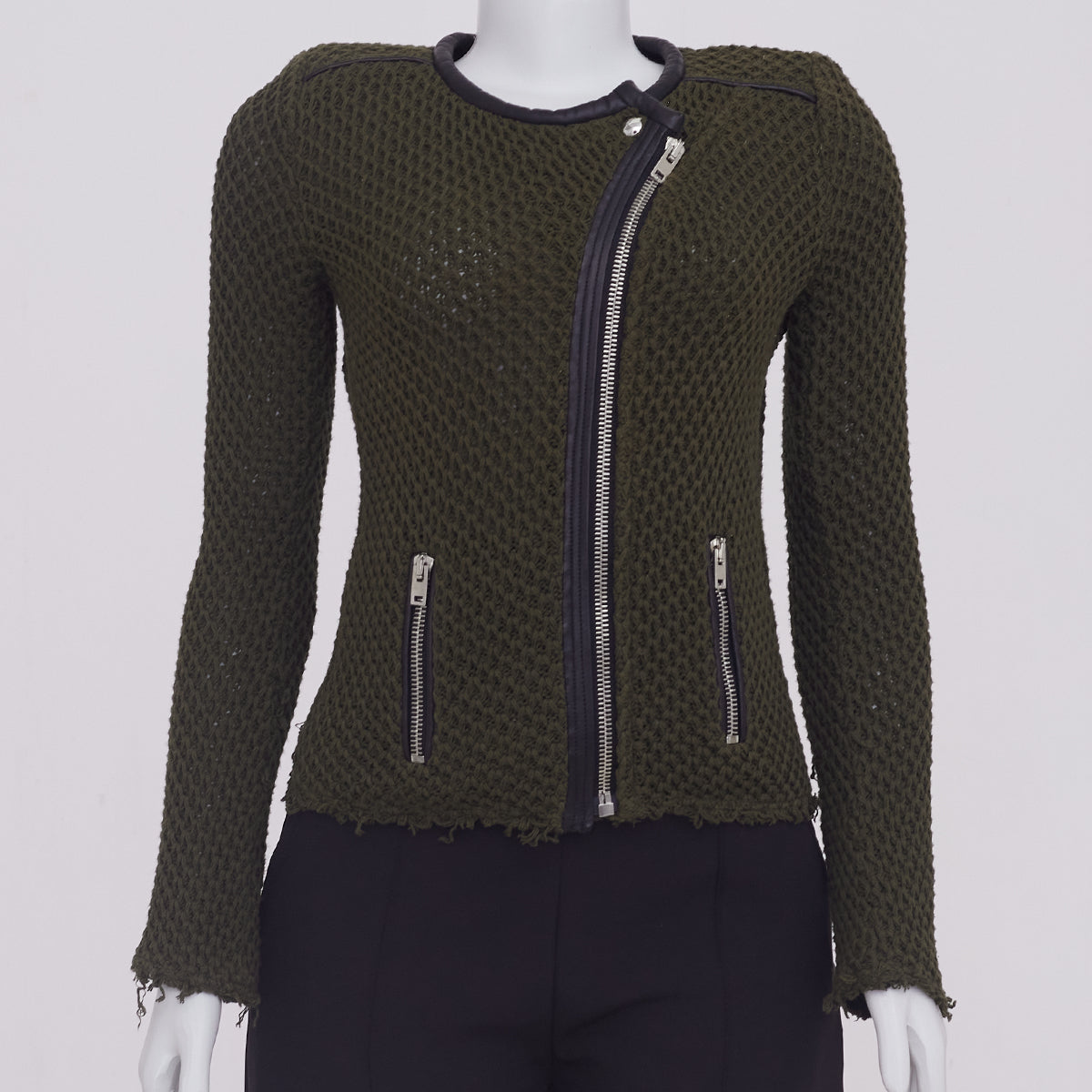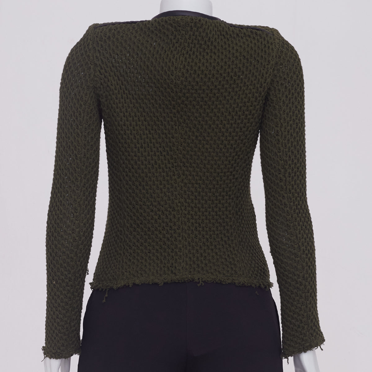 Detalhes: Modelo confeccionado em tricô em linha verde militar. Conta com acabamento em couro liso preto, detalhe de desfiados na barra e mangas, mangas compridas ferragens prateadas e dois bolsos frontais. Fecho em zíper.