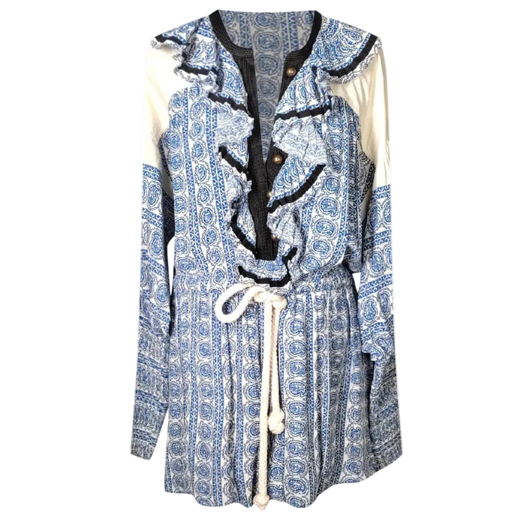 Detalhes: Macaquinho Philosophy confeccionado em tecido com estampa na cor azul e branco. Vestido possui modelagem soltinha ao corpo e de manga longa. Contem botões na gola de fechamento.