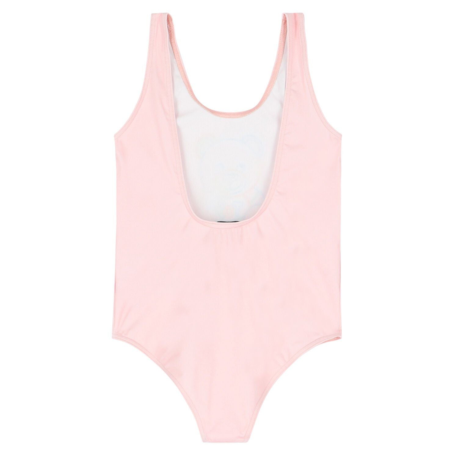 Detalhes: Maiô Moschino rosa com estampa de ursinho de pelúcia e logo da Moschino para meninas. Confeccionado em algodão macio, apresenta a icônica estampa do ursinho e do logo da marca em azul, cinza, verde, amarelo e laranja na parte frontal.
