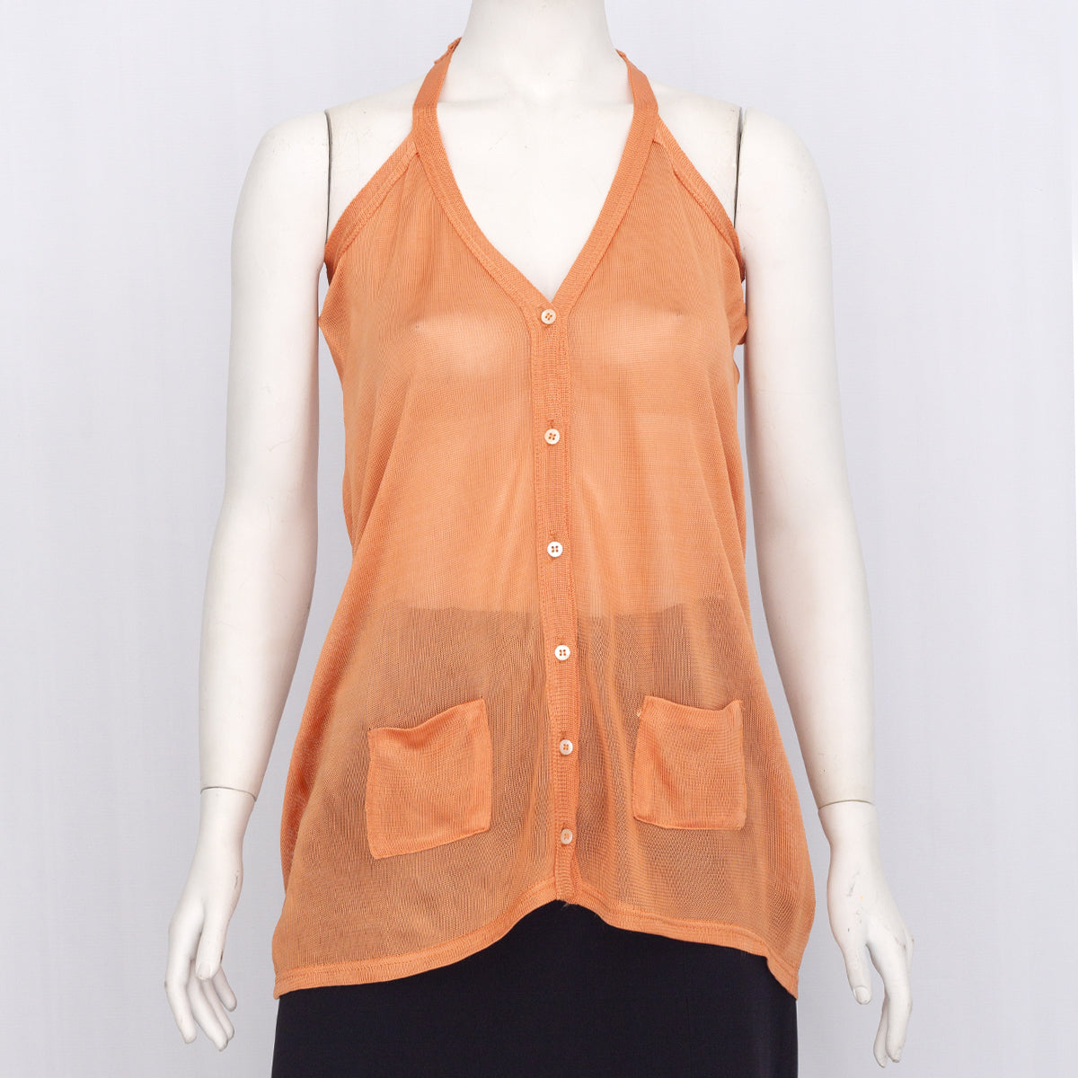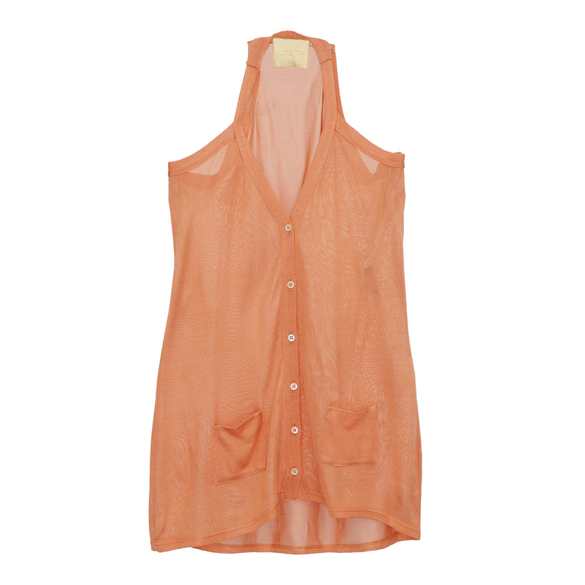 Detalhes: Malha Lolitta Salmão Tam. P/S. Regata em viscose com botoes perolados e bolsinhos na frente. Alças mais grossas e e costas nadador