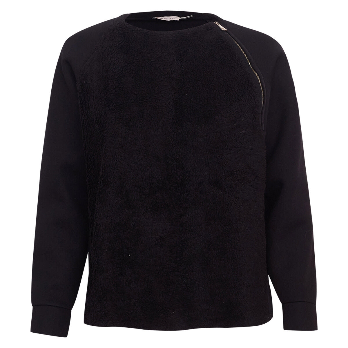 Detalhes: Malha Moncler confeccionada em algodão na cor preta. Possui mangas longas, gola redonda, detalhe em pelugem na parte frontal, e zíper. Contém a logo da Moncler na parte lateral da manga.
