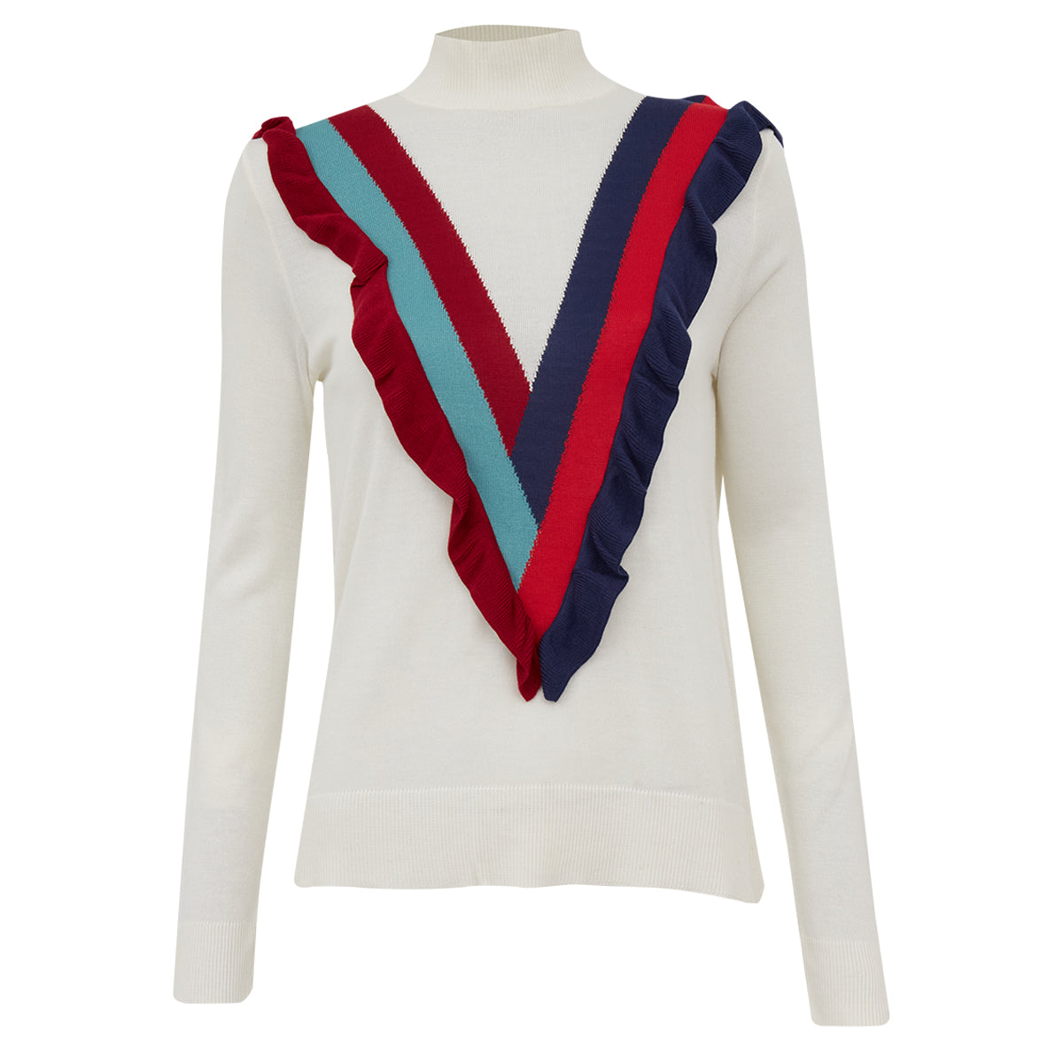 Detalhes: Blusa confeccionada em 100% Viscose. O modelo possui mangas longas, detalhes de listras em cores contrastantes, gola alta e modelagem reta.
