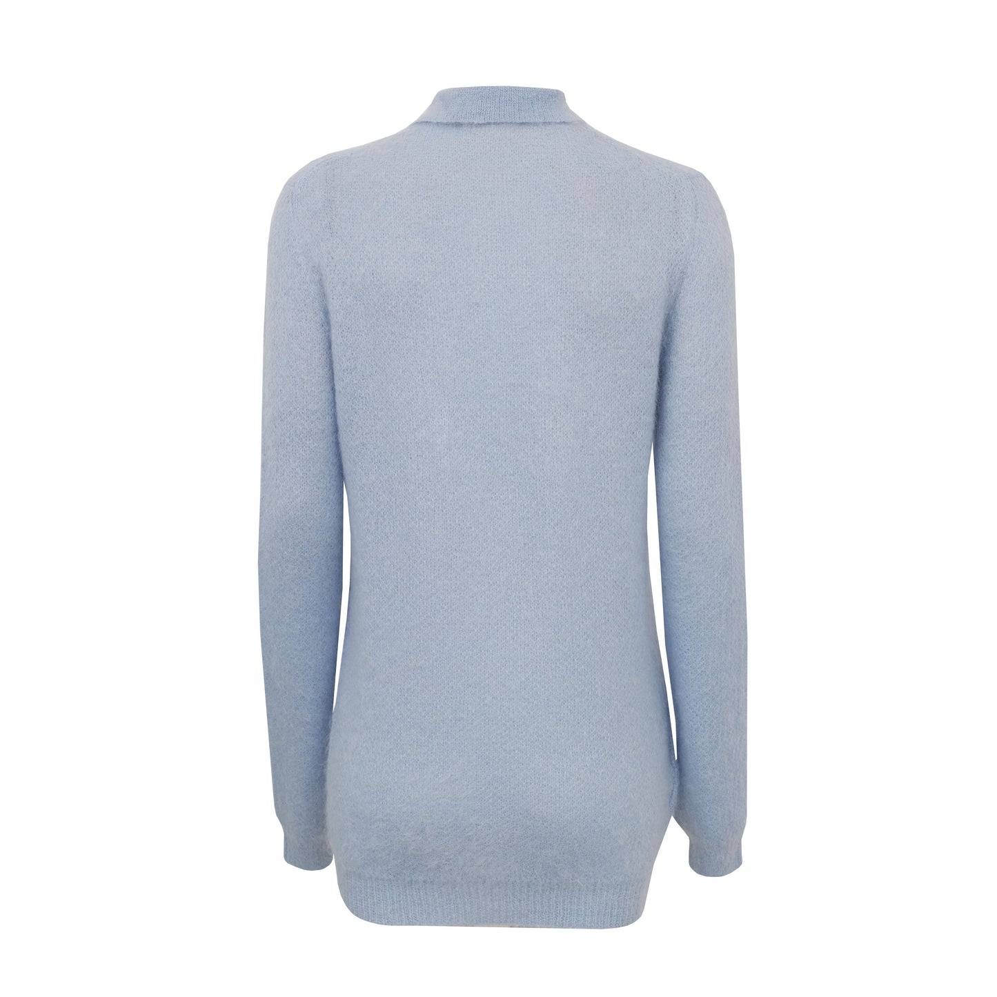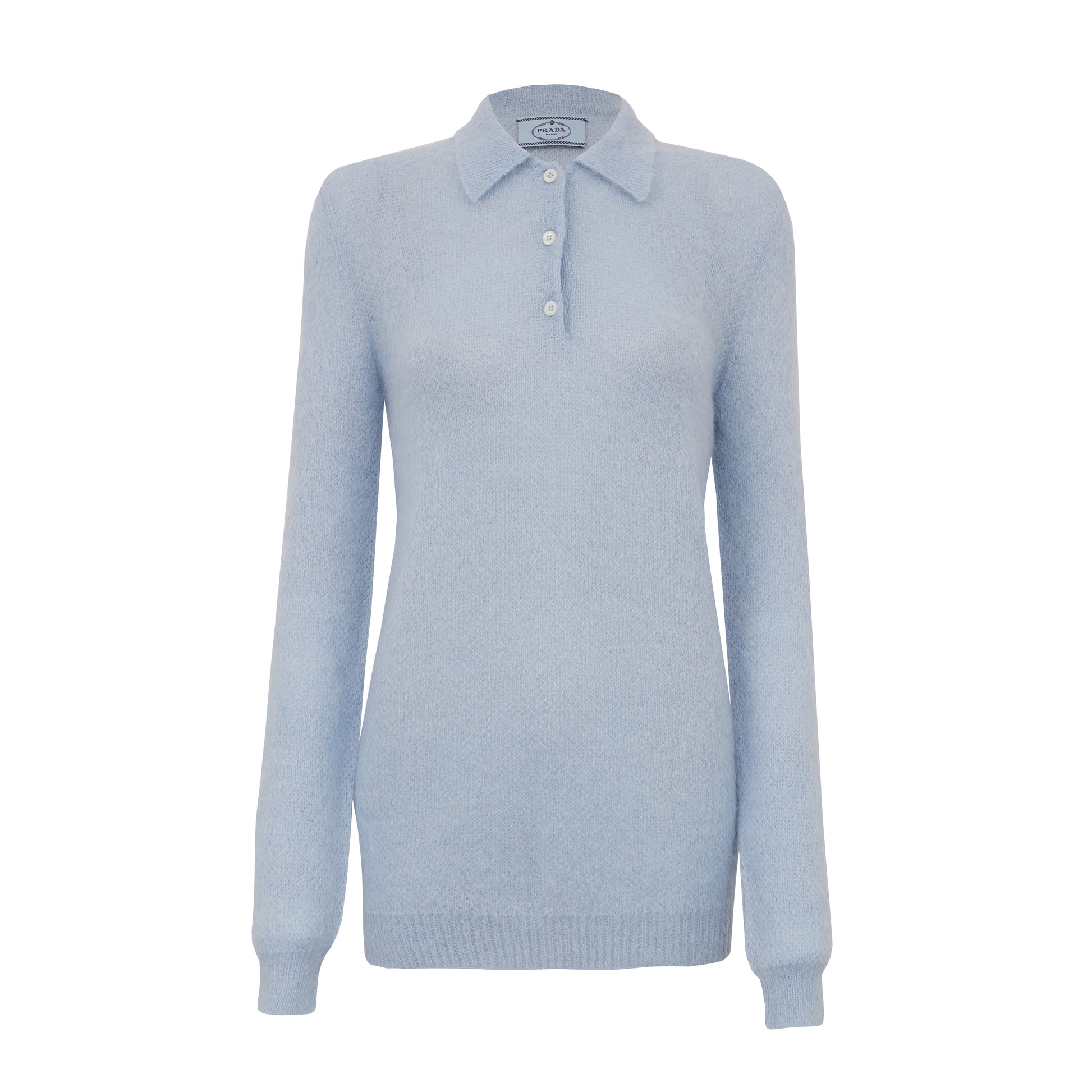 Detalhes: Malha Prada confeccionado em mohair na cor azul. Possui tecido semi transparente, gola polo com três botões na parte frontal, mangas compridas, punhos e bainha com detalhes canelado.