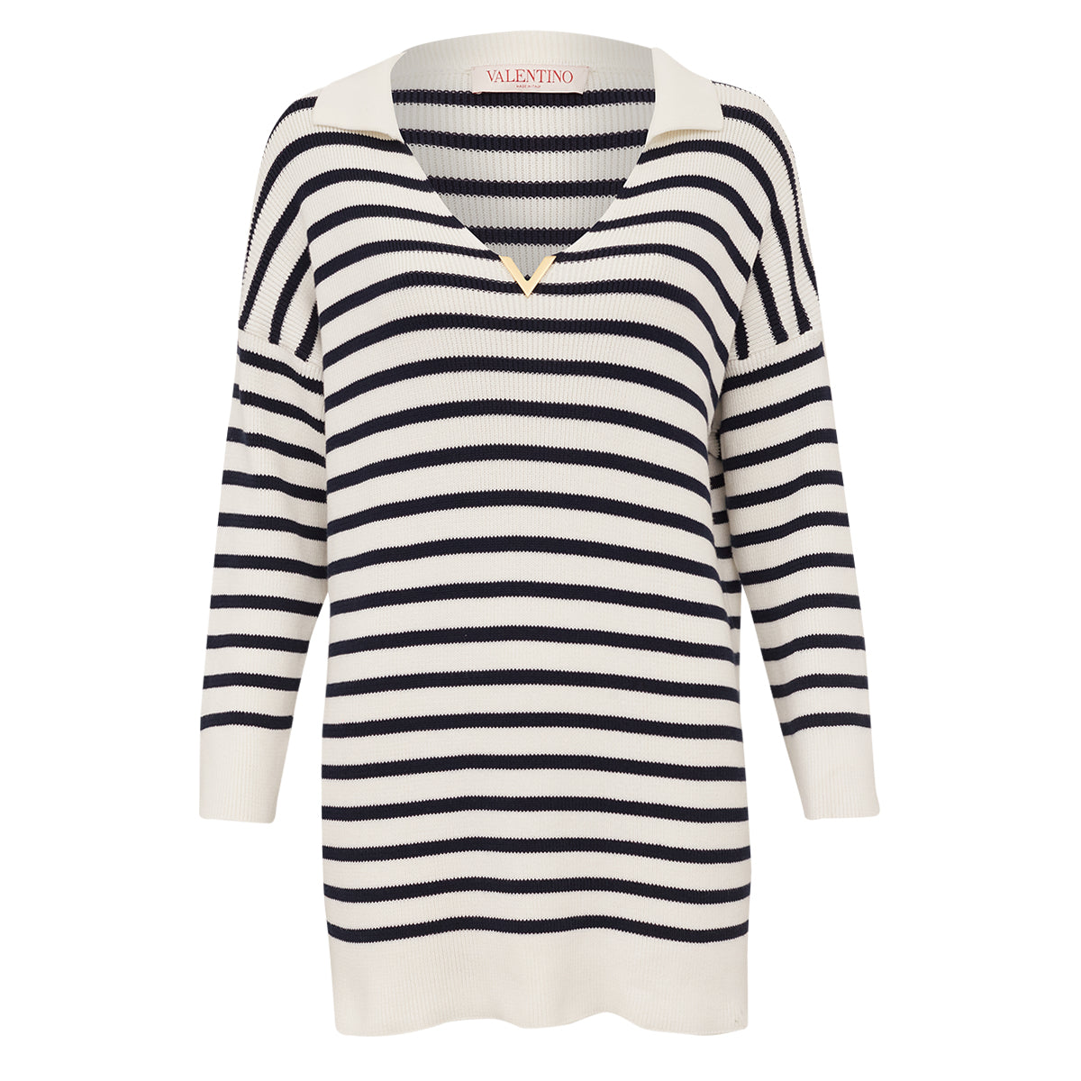Detalhes: Malha com padrão de listras horizontais. Gola polo com decote em V. Placa de metal dourada com o logo VLogo Signature na ponta do decote.