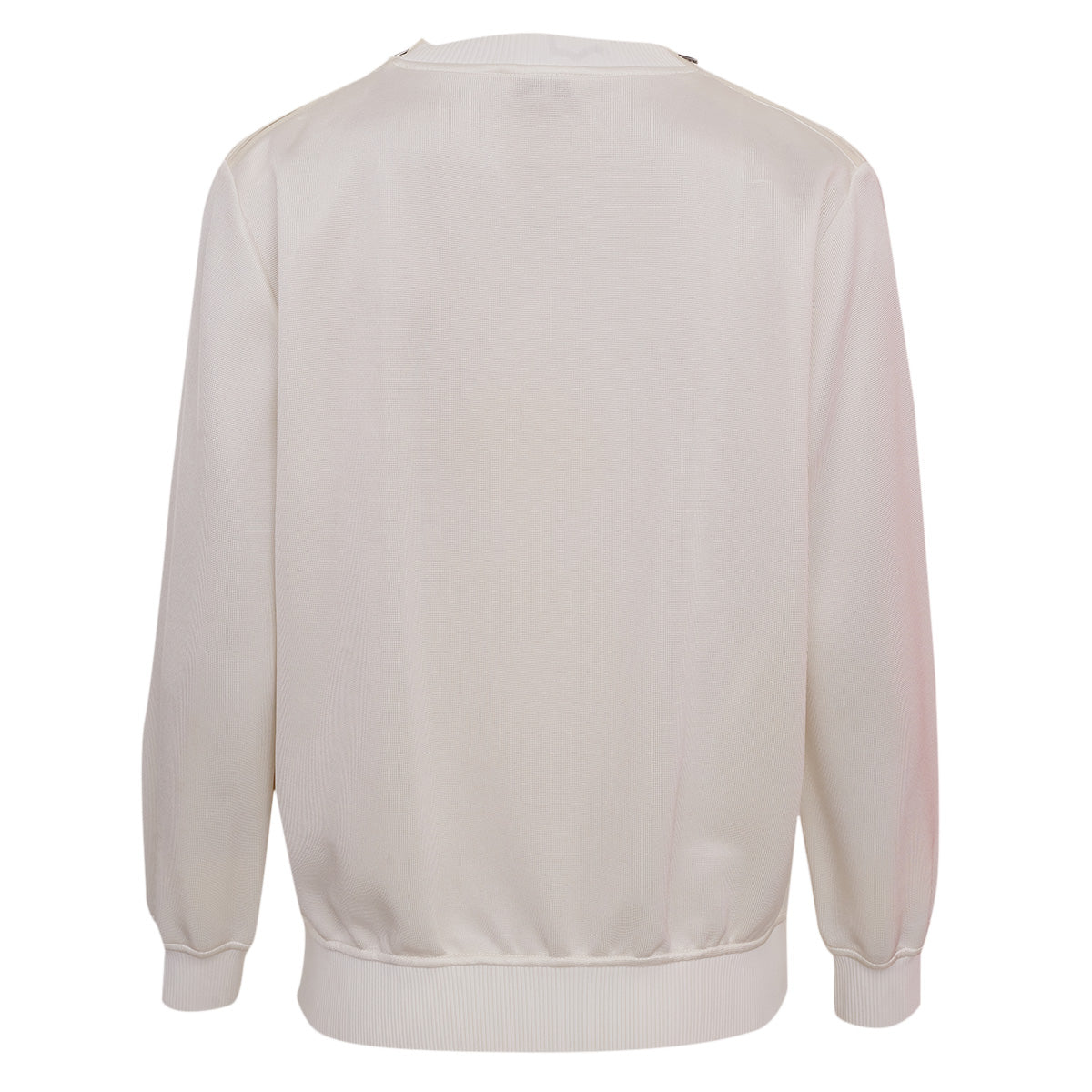 Detalhes: Moletom Fendi confeccionado em tecido na cor off white. O modelo possui decotes redondos, mangas longas, zíper nos ombros, Karl Love e logo bordado em laranja, detalhe de pelinhos azul e preto, Karl em paetê branco e linha preta brilhante , punho, barra e gola canelados.