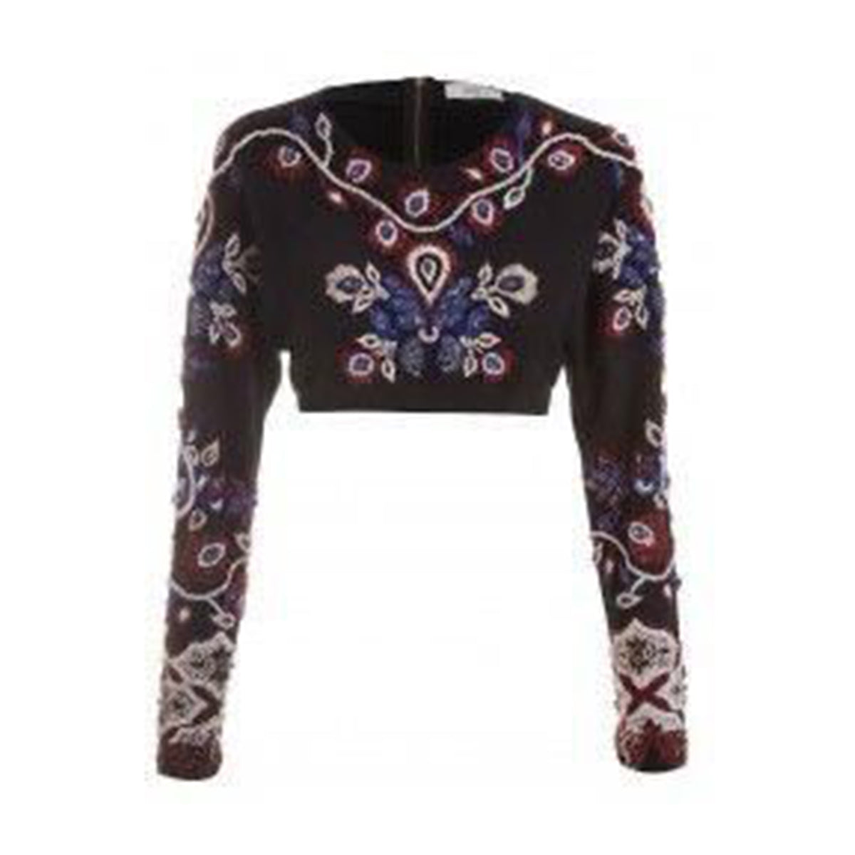 Detalhes: Modelo confeccionado em tecido preto. Possui modelagem cropped, mangas compridas, gola arredondada e detalhe de bordados em vidrilhos em tons de preto, vermelho, azul e branco. Fecho por zíper posterior.