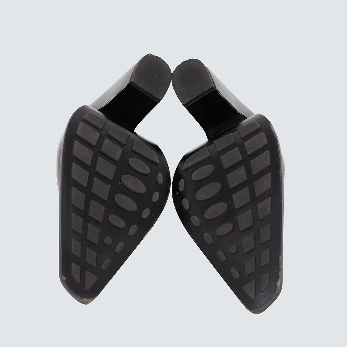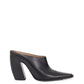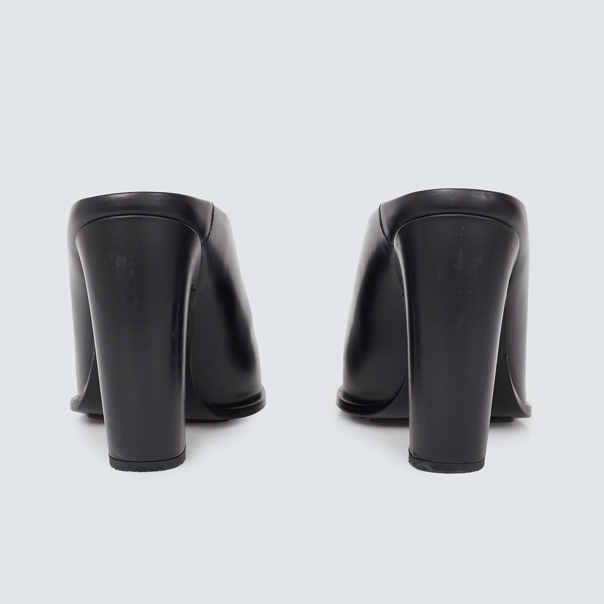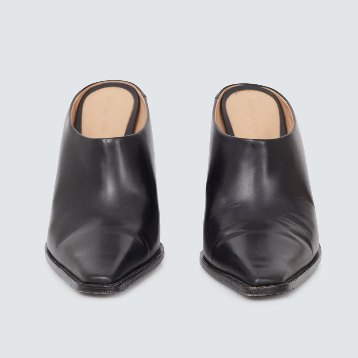 Detalhes: Mule Bottega Veneta confeccionado em couro na cor preta. Modelo possui frente fechada, bico fino assimétrico e salto alto grosso.