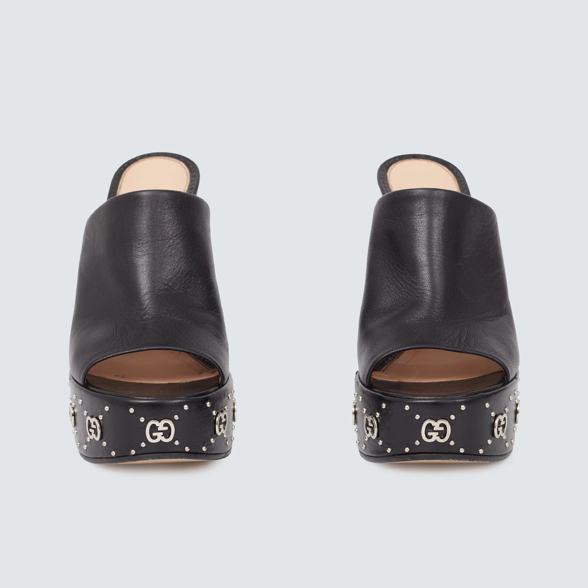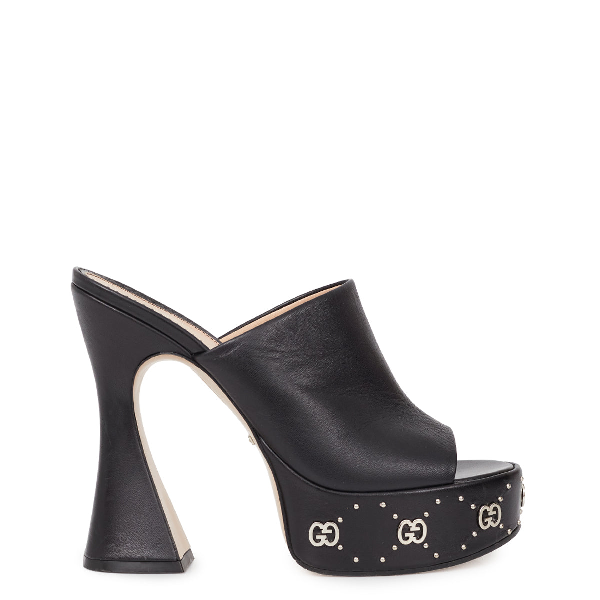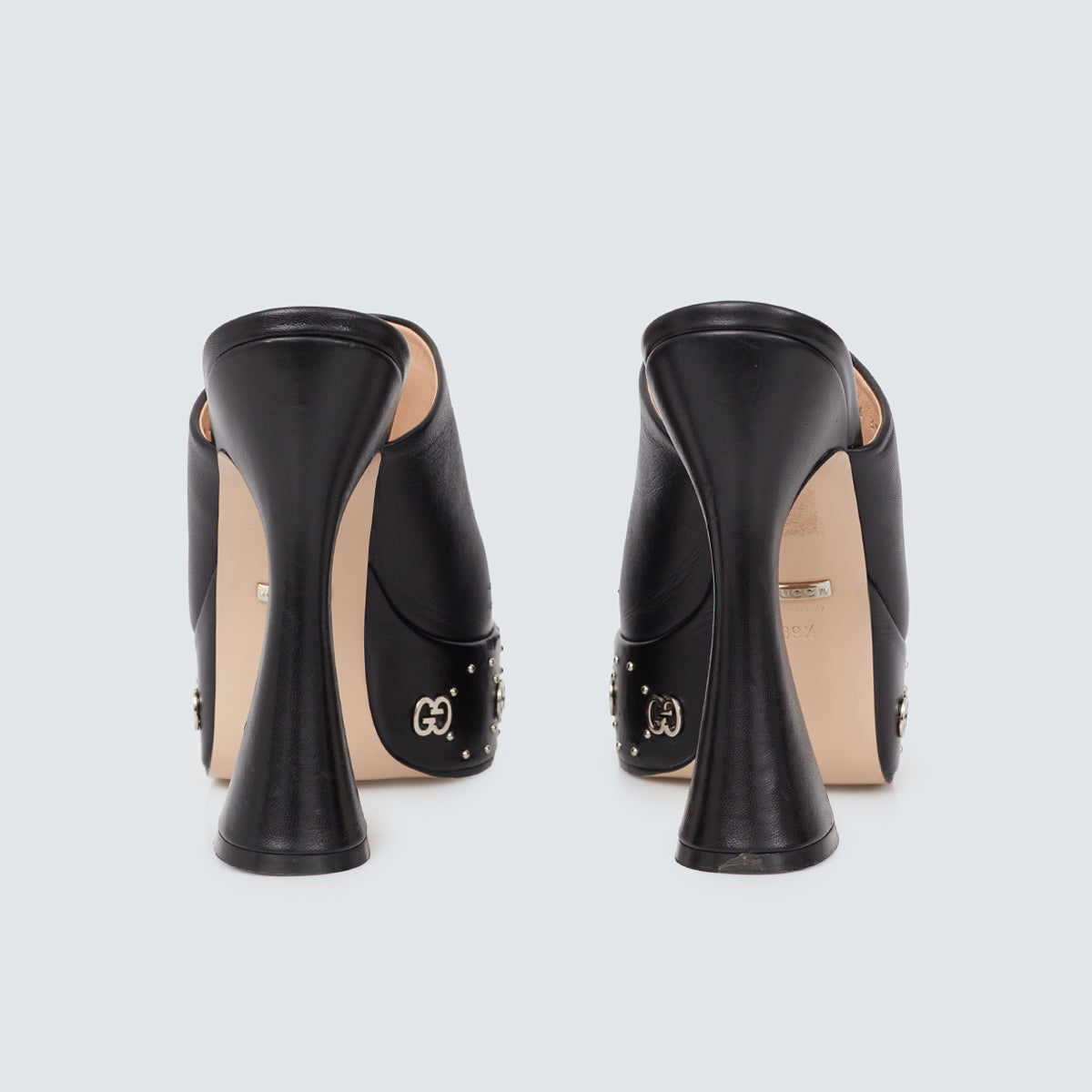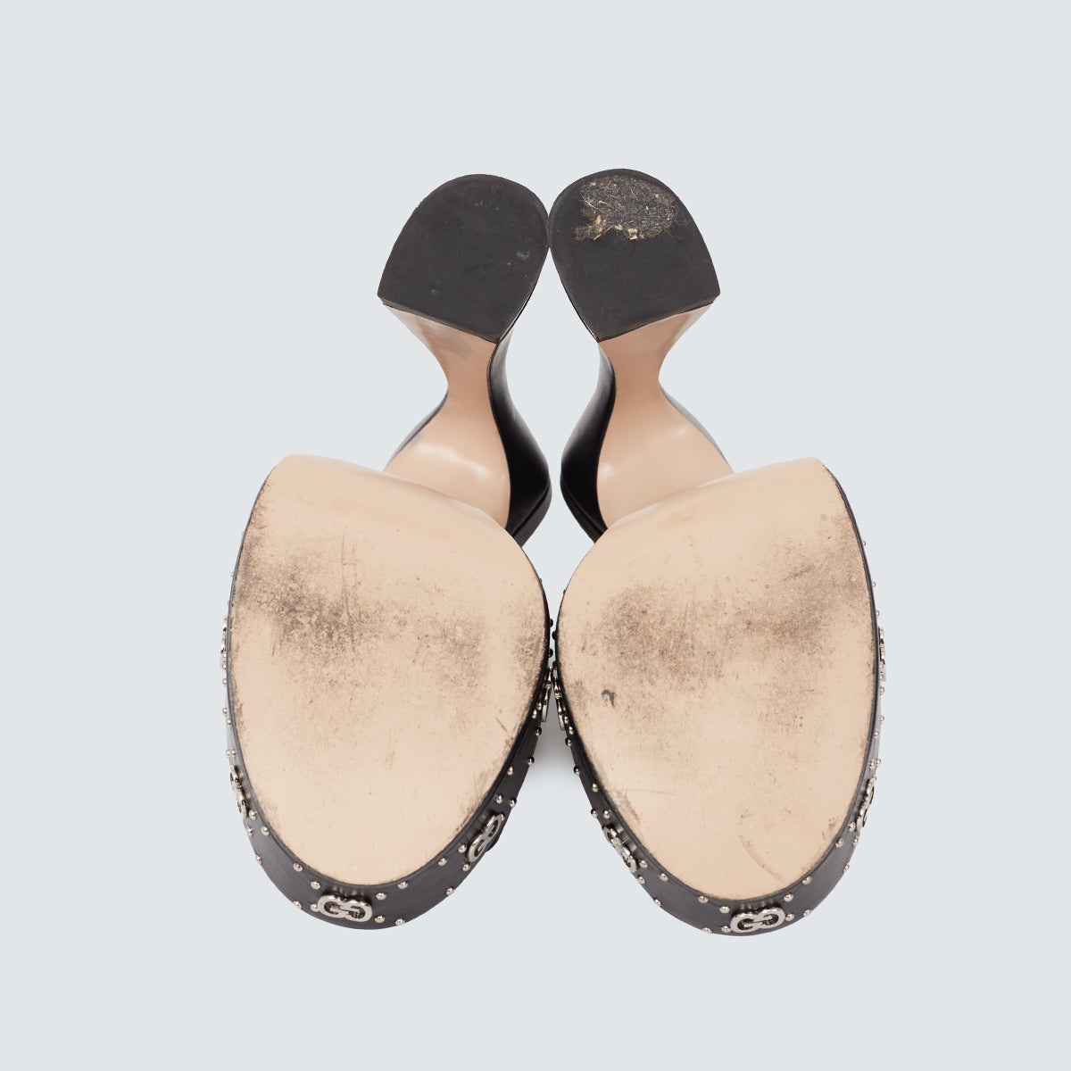 Detalhes: Mule Gucci confeccionado em couro na cor preta. Modelo possui encaixe acolchoado em tira grossa para os pés, abertura para os dedos, e salto alto grosso. Detalhes em aplicações com logo da marca metalizado na meia pata. *Acompanha dust e caixa da marca*
