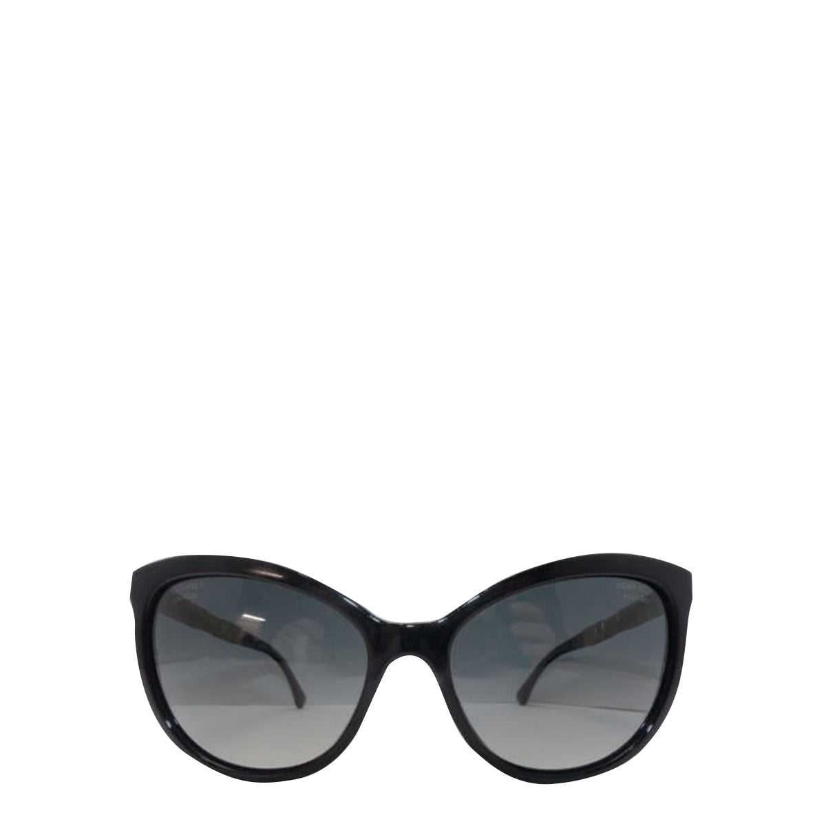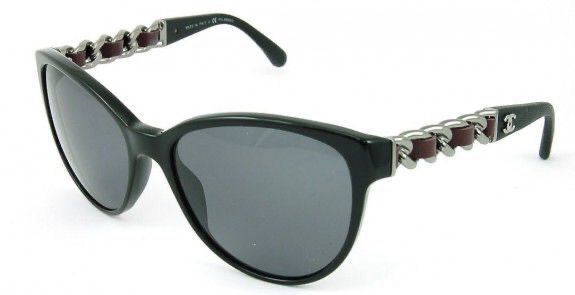 Detalhes: Modelo confeccionado em acetato preto. Possui armação arredondada, lentes escuras e hastes finas com detalhes de corrente prateada e couro vinho. *Acompanha estojo da marca*