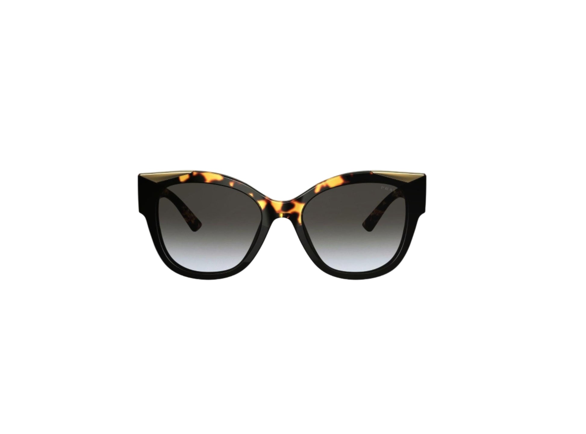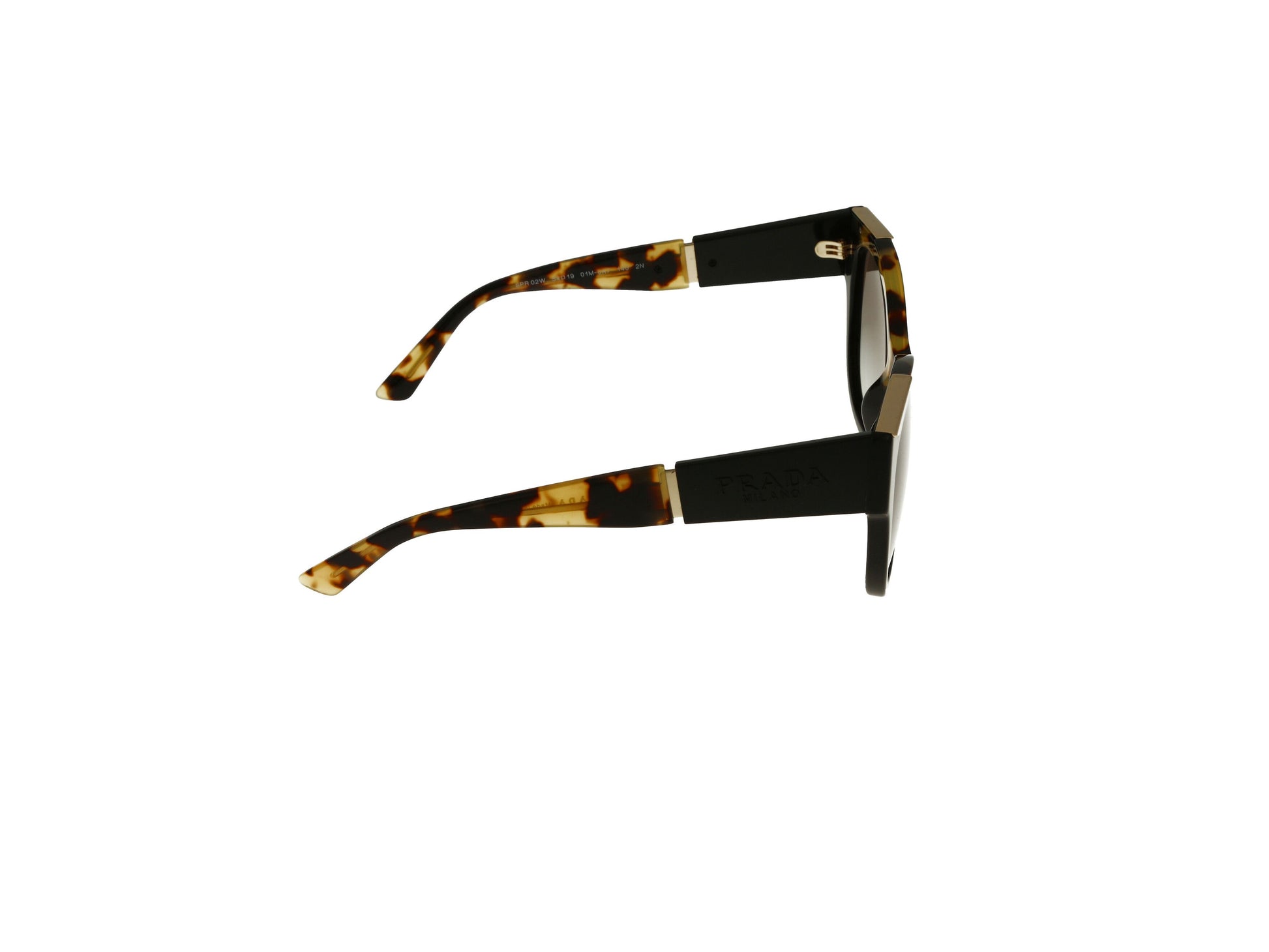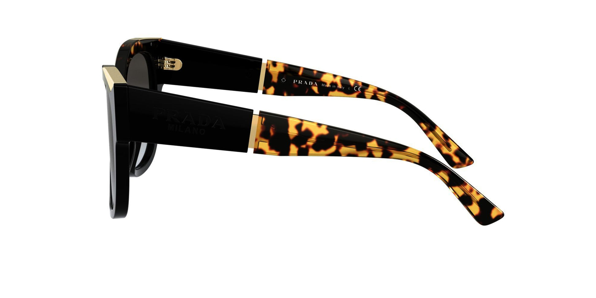 Detalhes: Óculos da Prada no estilo Gatinho (Cat-eye), a armação apresenta uma combinação de preto na parte inferior e nas hastes, com um padrão tartaruga (havana) na parte superior da frente e nas laterais das hastes, possui detalhe metálico dourado na parte superior das lentes e possui lentes escuras com um leve degradê.