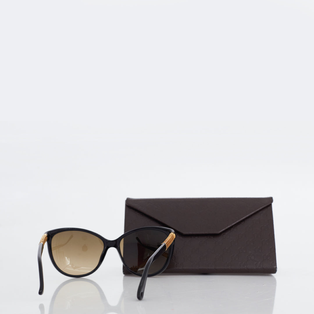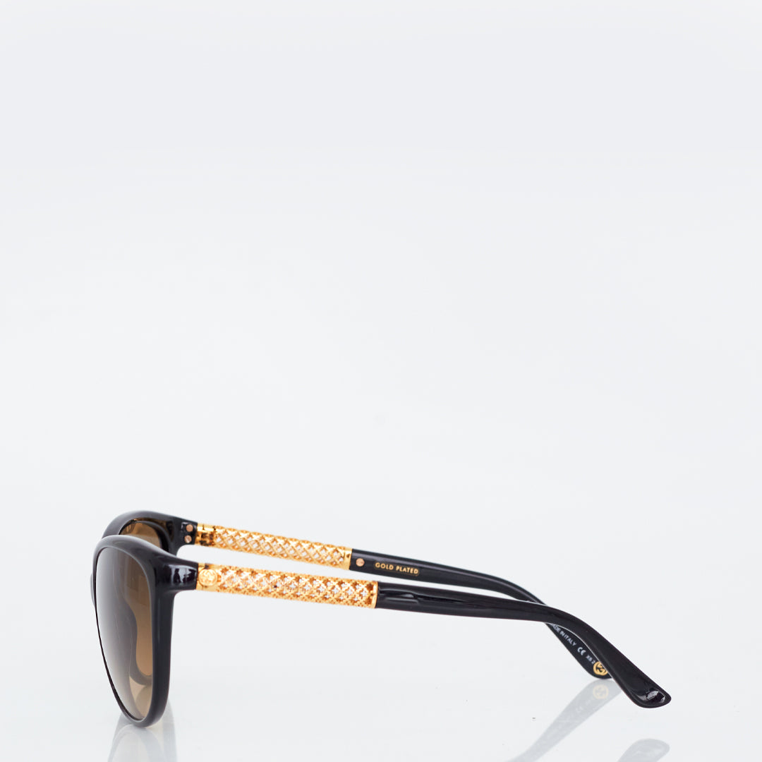 Detalhes: Modelo confeccionado em acetato preto. Possui armação arredondada, lentes marrom em degradê e hastes finas com detalhe em metal dourado.*Acompanha estojo da marca*