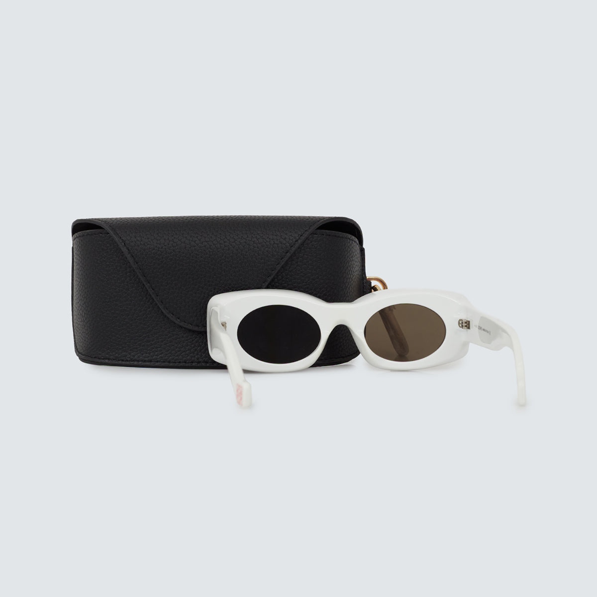 Detalhes: Modelo com design moderno, combinando frente em tom rosa com lentes escuras e acabamento branco na parte traseira e nas hastes. O contraste de cores confere personalidade e sofisticação ao modelo. *Acompanha estojo da marca*