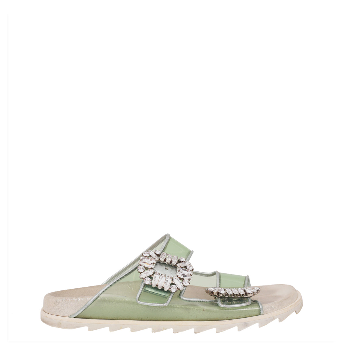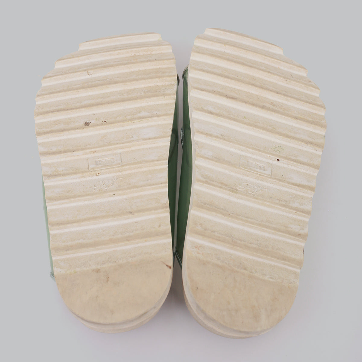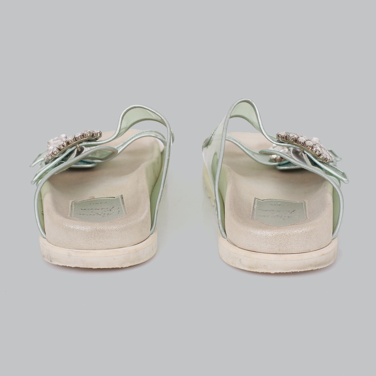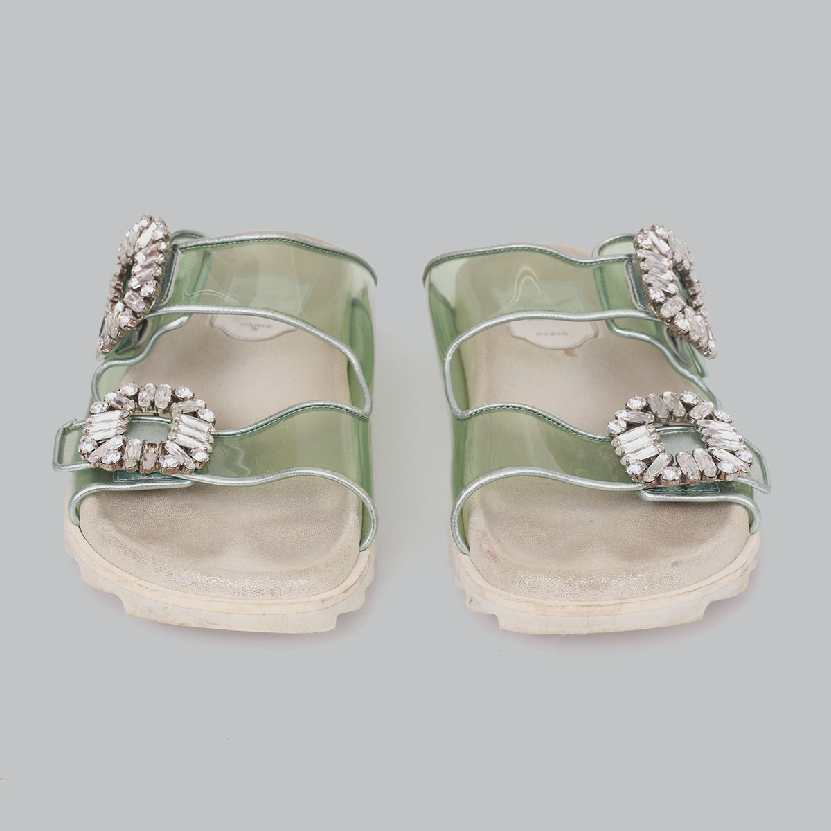 Detalhes: Papete confeccionada em plástico na cor verde, com acabamentos em couro prata. Modelo possui sola em borracha e detalhes de fivela em pedrarias.