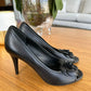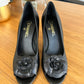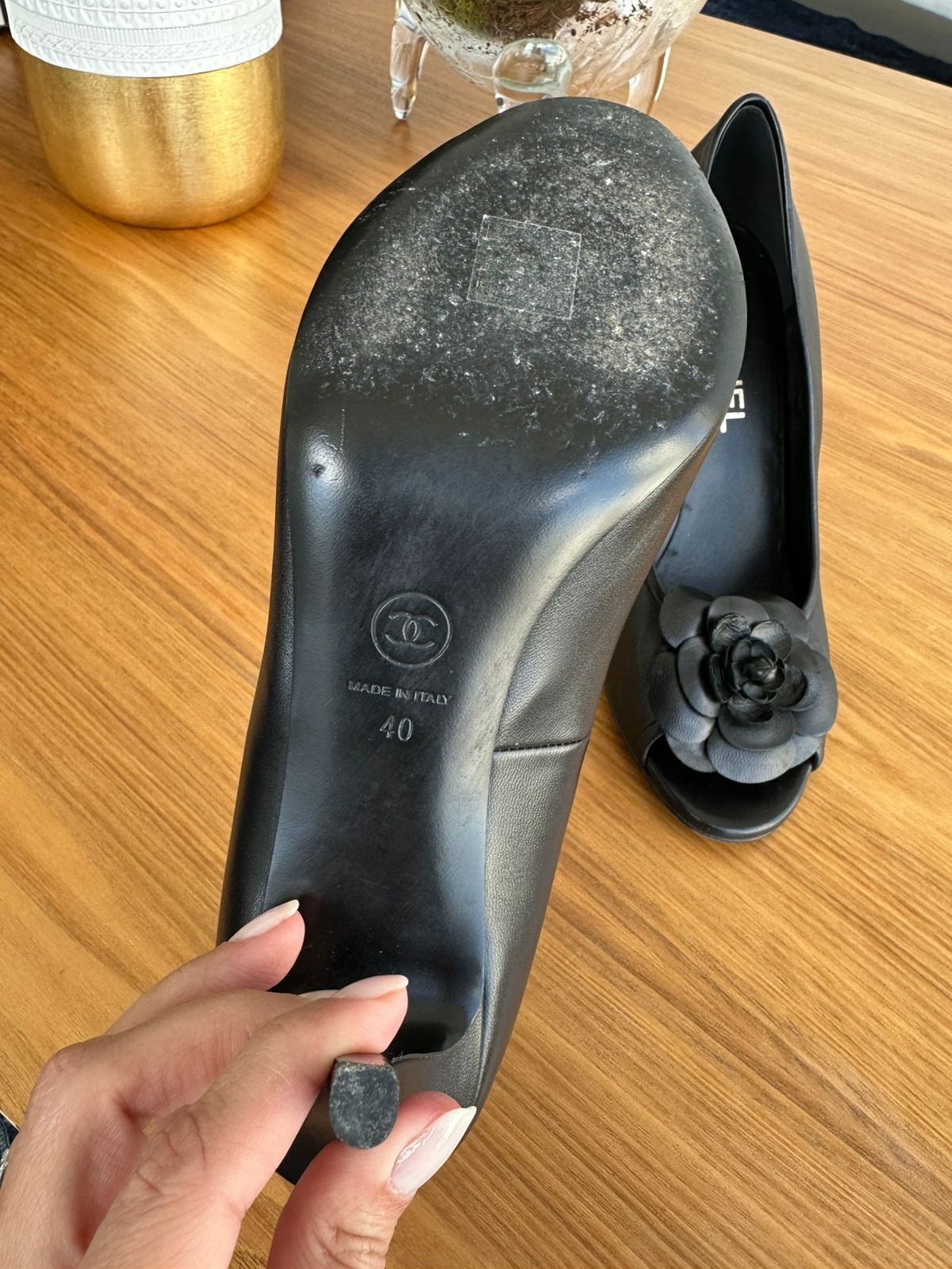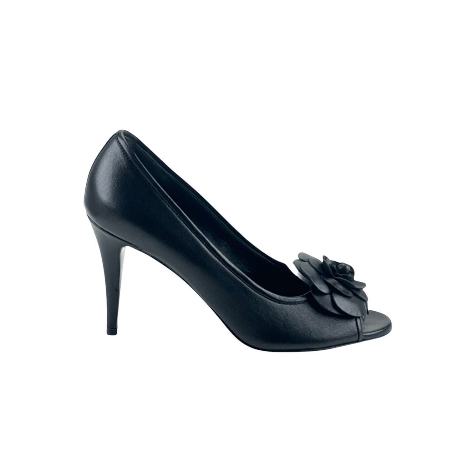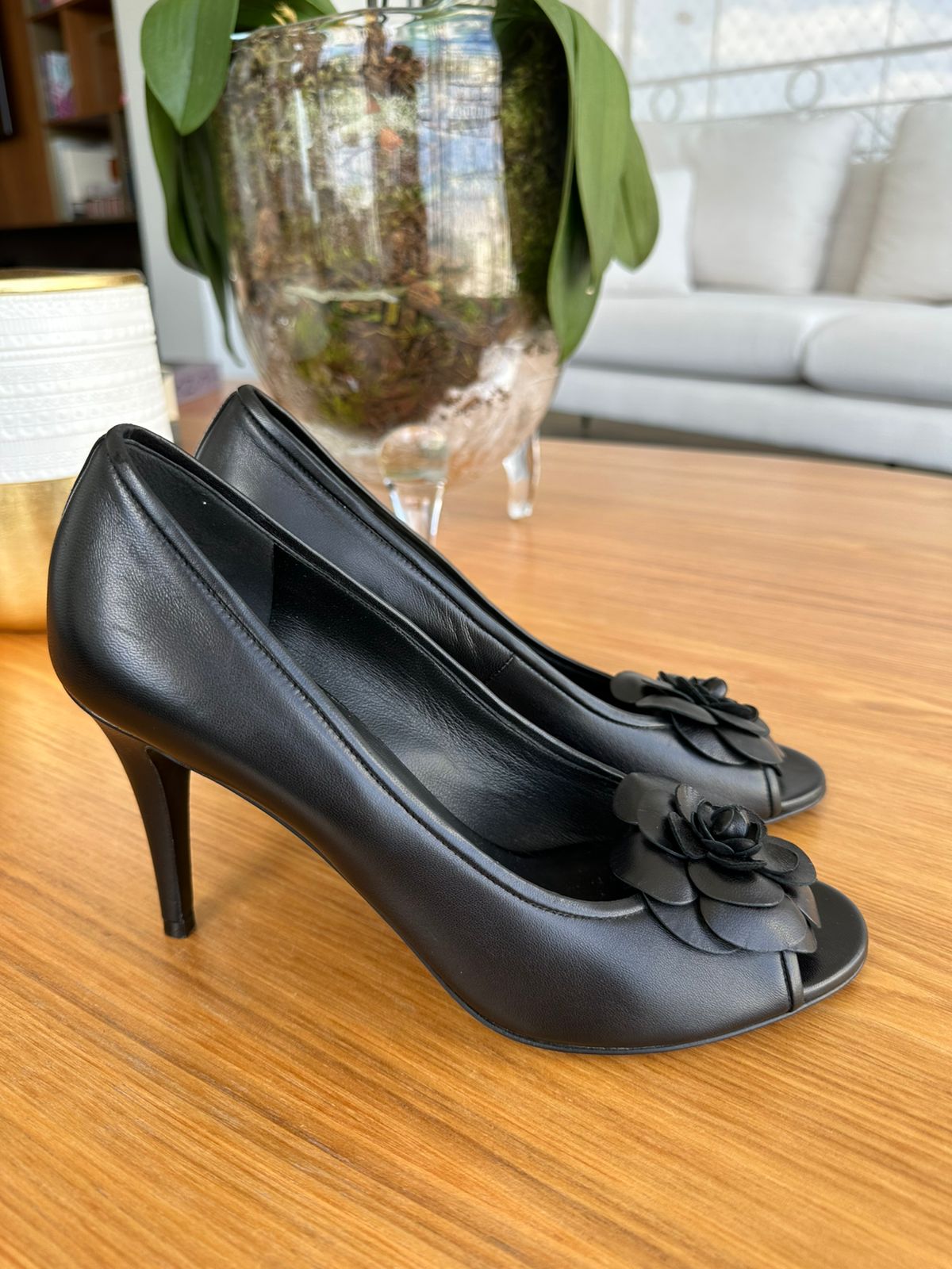 Detalhes: Sapato Peep Toe Chanel confeccionado em couro na cor preta. Possui salto alto, abertura para os dedos e flor camélia.