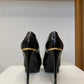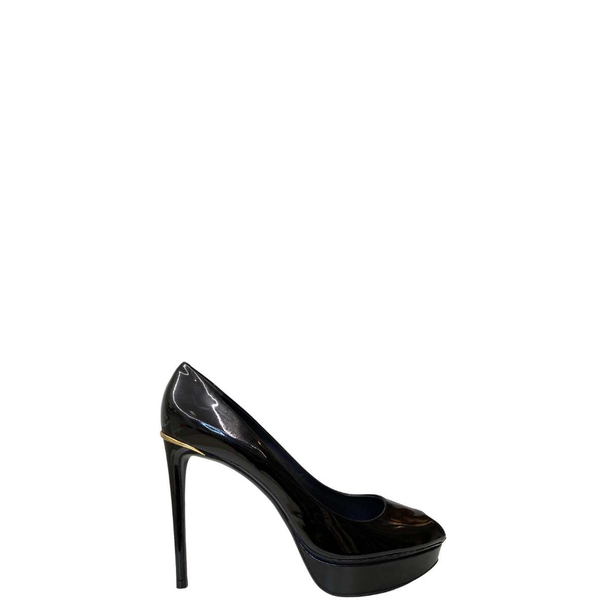 Detalhes: Modelo confeccionado em verniz preto, possui salto alto com abertura na ponta, meia pata e um detalhe em dourado na parte traseira com o nome da marca.