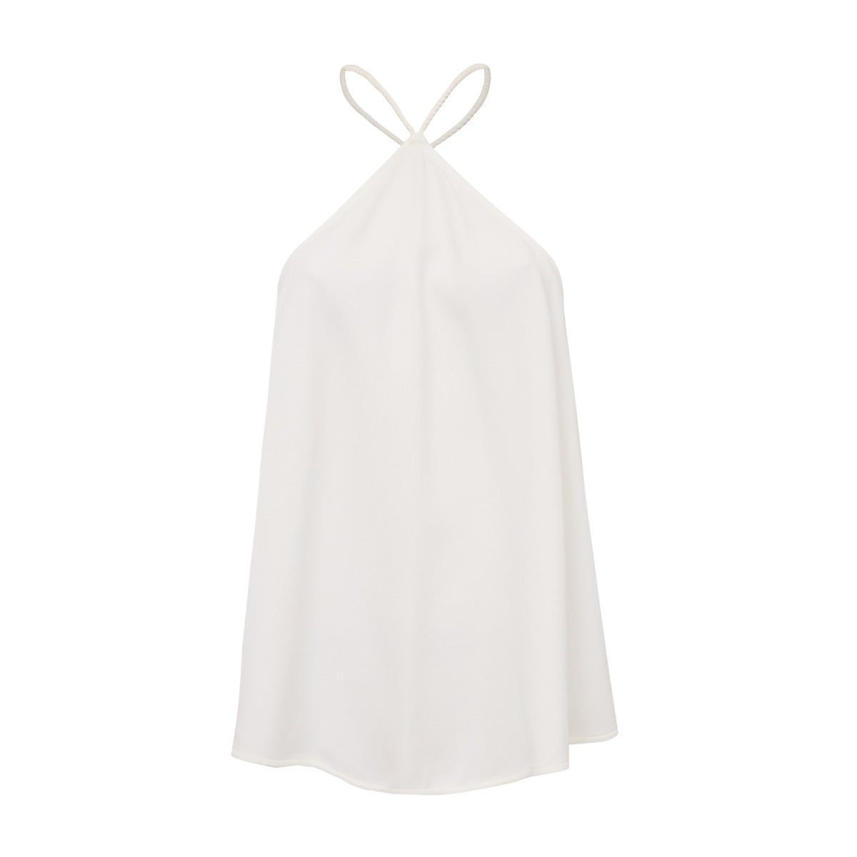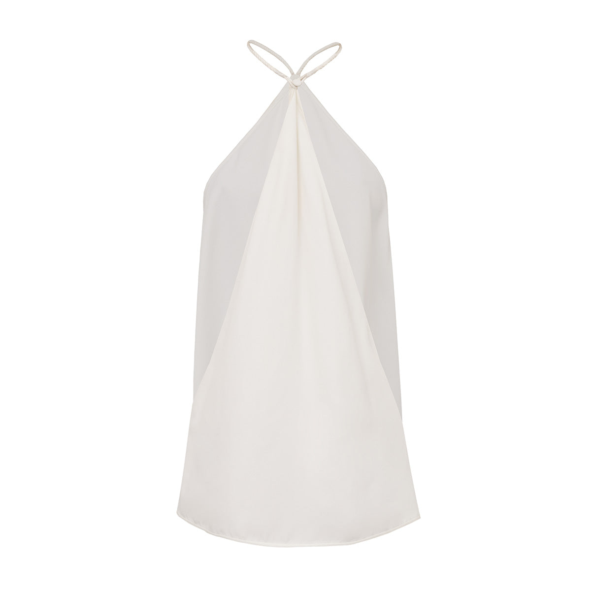 Detalhes: Regata Paula Raia confeccionado em acetato na cor branca. Possui modelagem regata, forro 100% algodão, cavada na lateral, alças finas em cordão . Fechamento por botão na parte de trás.