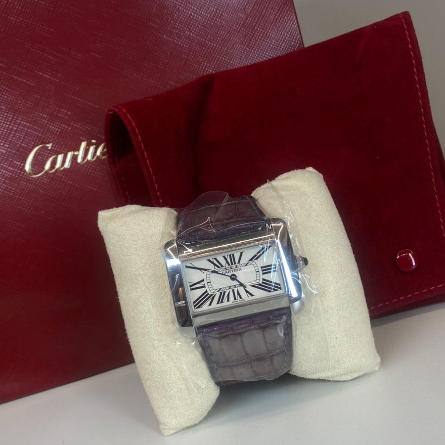 Detalhes: Relógio Cartier Tank Divan confeccionado em aço e sua pulseira em couro de crocodilo na cor marrom. Possui formato retangular, ponteiros em aço, e numeros em algarismos romanos. *Acompanha dust e sacola da marca.*