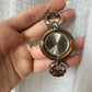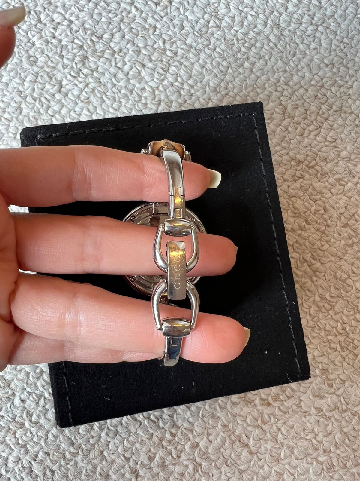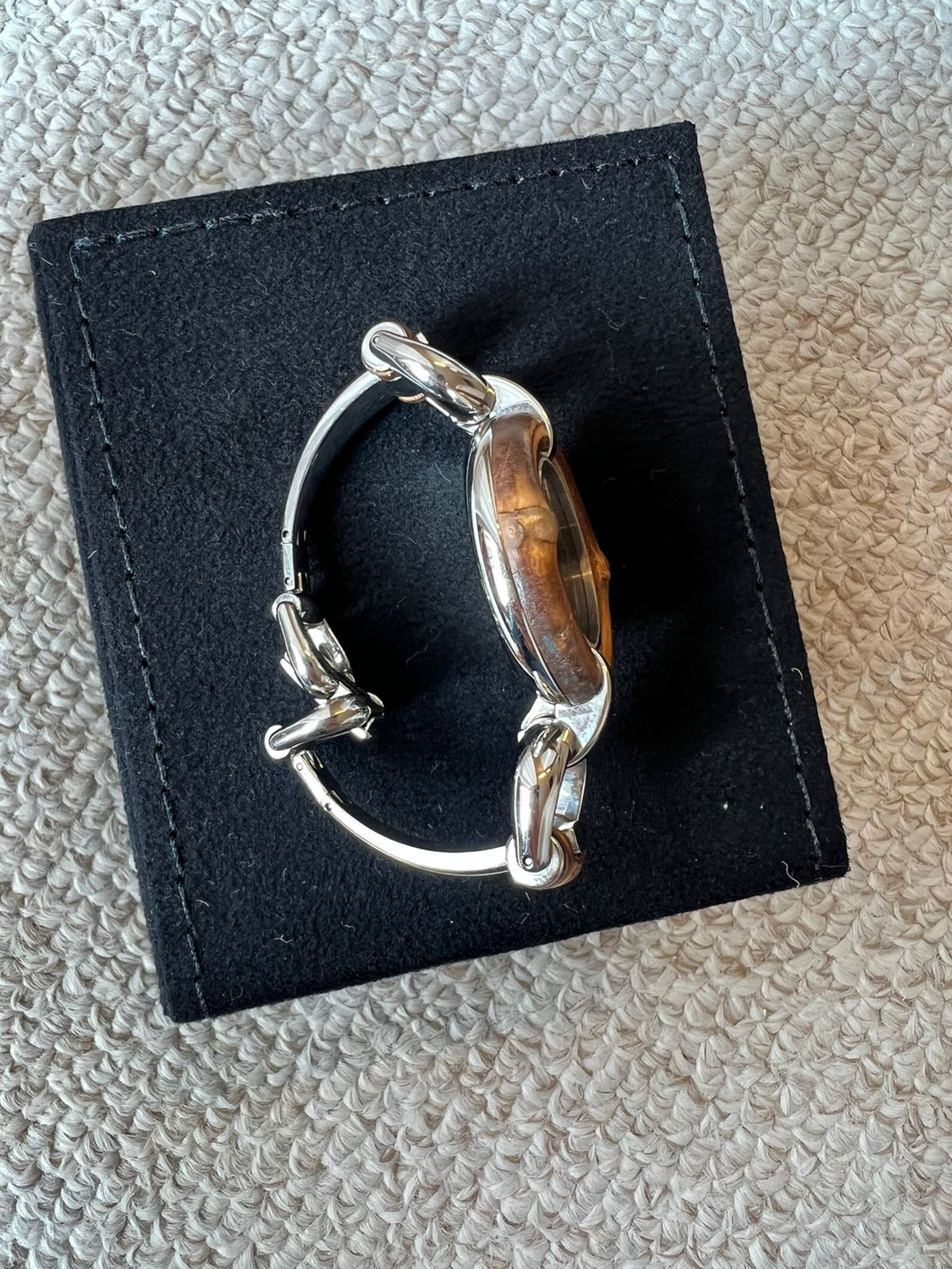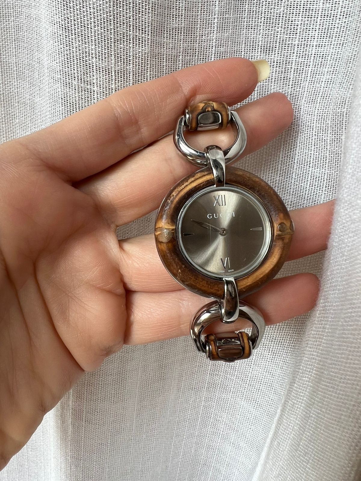 Detalhes: Relógio Gucci Bamboo Brown Sun, possui pulseira de aço inoxidável com detalhes em bambu marrom, base circular e contagem em algarismo romano.