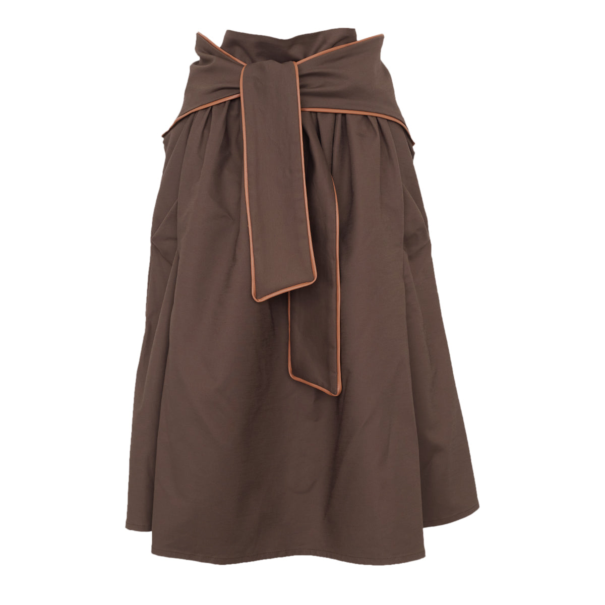 Detalhes: Saia Adriana Degreas confeccionada em algodão e elastano na cor Fendi. Possui detalhe em couro bege na cintura, faixa para amarração e dois bolsos laterais.