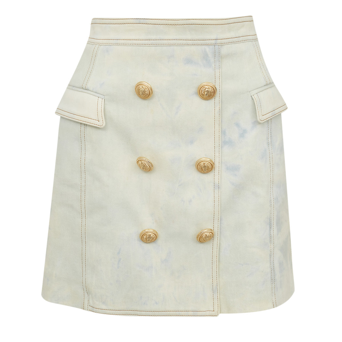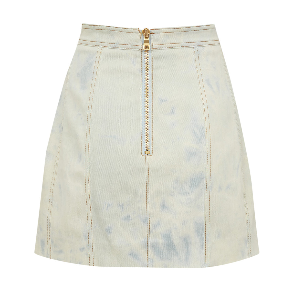 Detalhes: Saia Balmain confeccionada em jeans lavagem clara. O modelo apresenta modelagem midi, bolsos frontais, botões dourado e zíper traseiro.