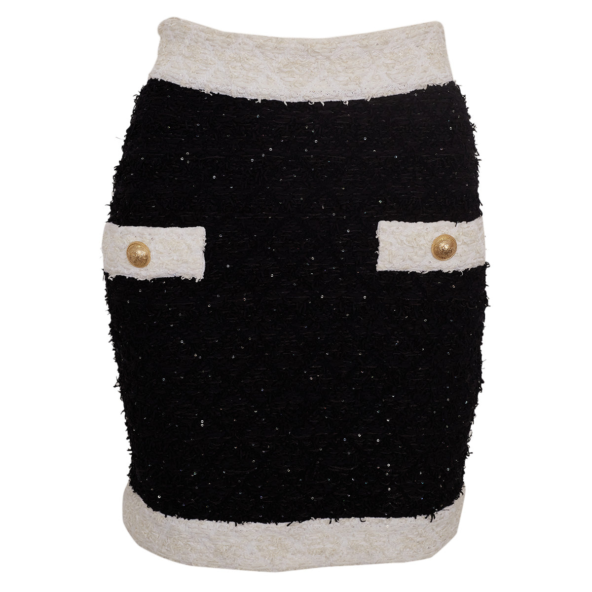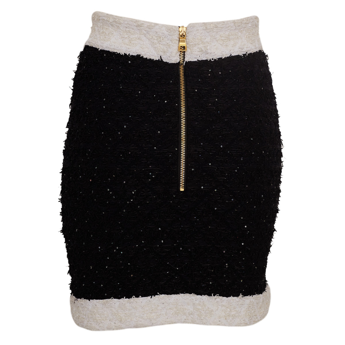 Detalhes: Saia Balmain confeccionada em tecido na cor preto e branco. Modelo possui modelagem justa, comprimento curto, dois bolsos frontais falsos, botões dourados frontais. Fechamento em zíper posterior.