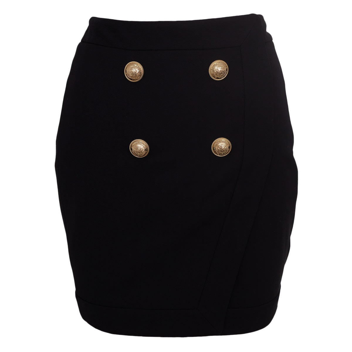 Detalhes: Saia Balmain confeccionada em tecido na cor preta. Modelo possui modelagem justa, comprimento curto, sobreposição frontal e quatro botões dourados com logo e brasão da marca. Fechamento em zíper posterior.