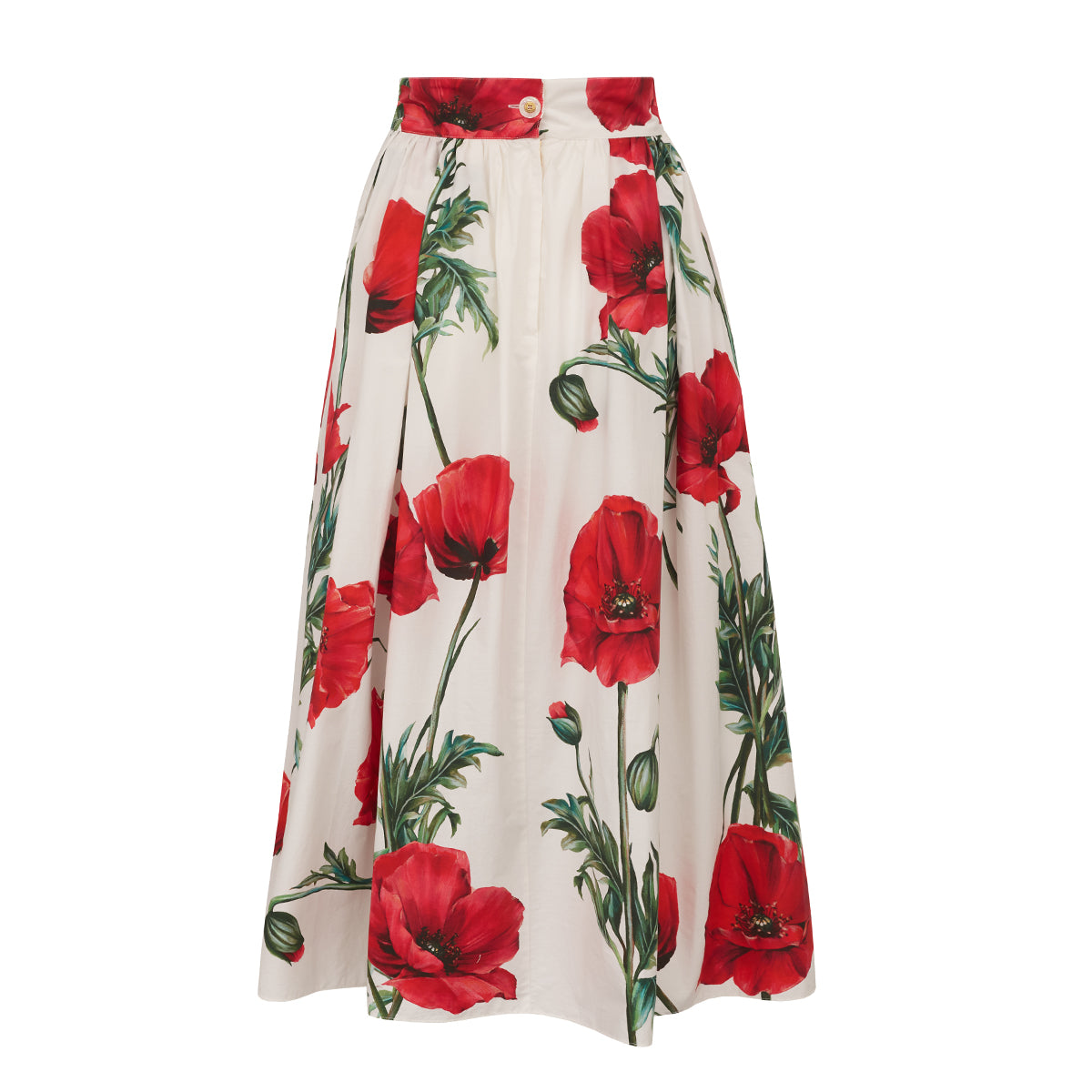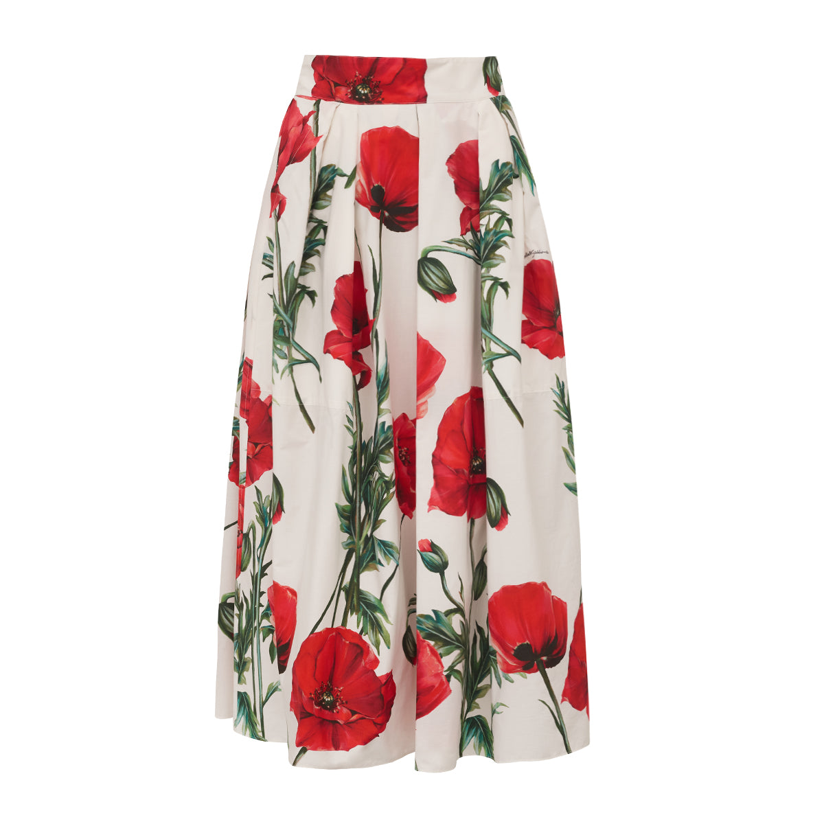 Detalhes: Saia Dolce & Gabbana confeccionada em algodão na cores branca, vermelho e verde. Modelo possui comprimento longo , cós alto e barra rodada, estampa floral. Fechamento por zíper e botão posterior.