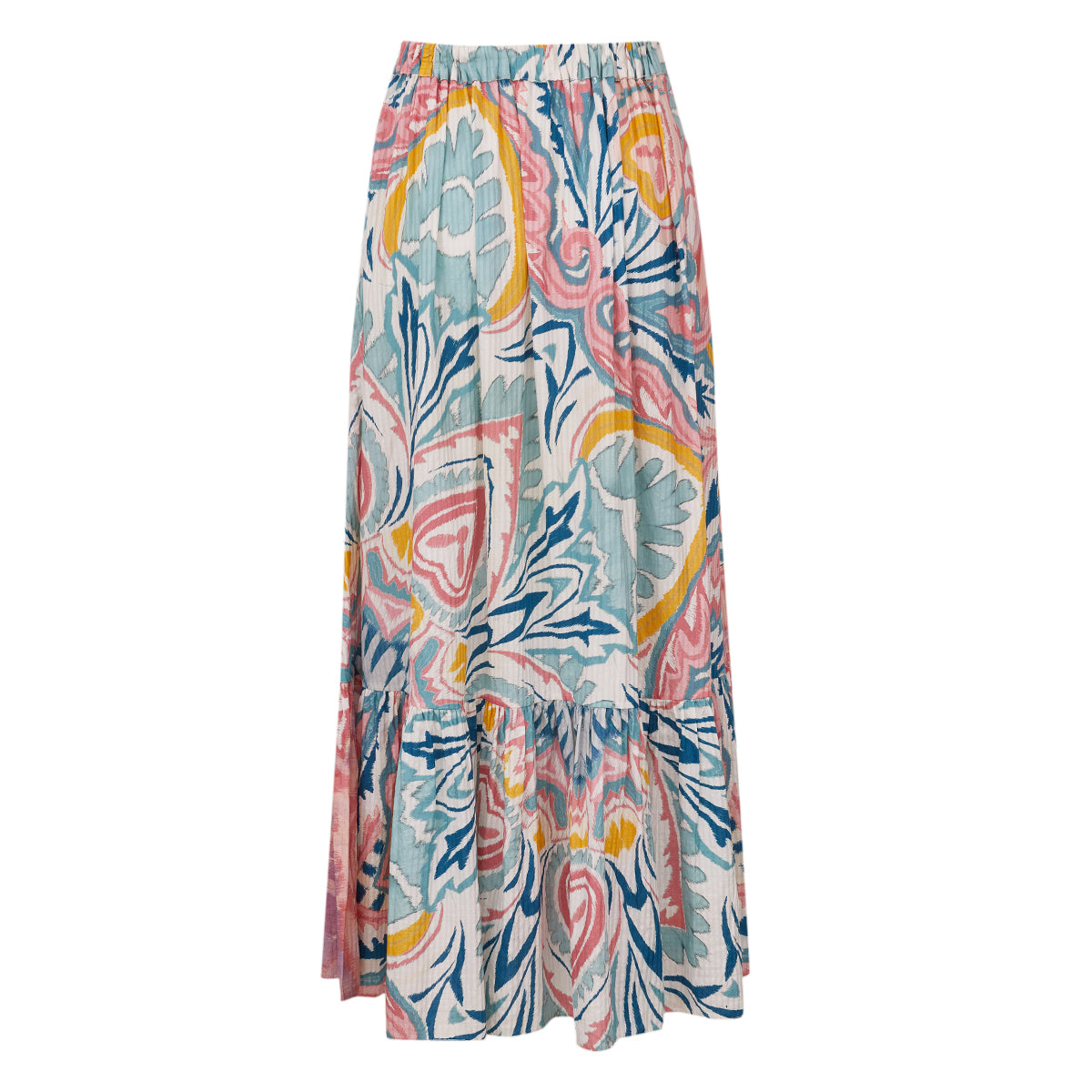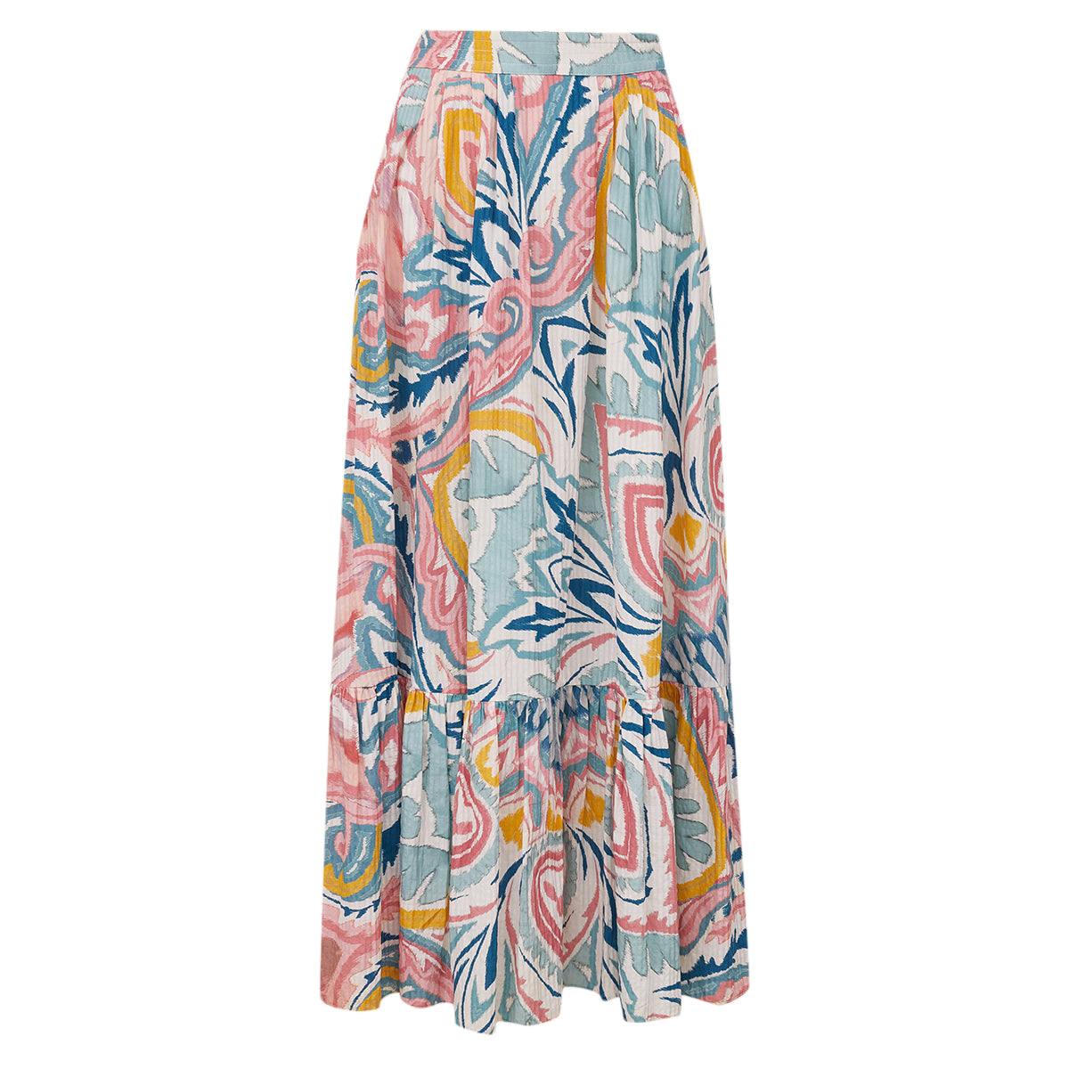 Detalhes: Saia Etro confeccionada emtecido na estampado cor off white, azul, rosa e amarelo. Modelo possui comprimento longo, possui drapeado na cintura e barra levemente ampla. Detalhe em elstico na cintura na parte de tras.