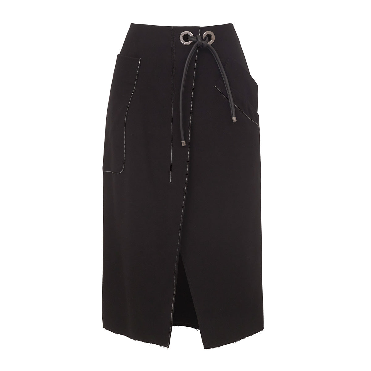 Detalhes: Saia Framed confeccionada em viscose na cor preta. Modelo possui comprimento midi, fenda frontal, bolsos grandes laterais e detalhe em ilhós com corda de couro frontal. Fechamento por zíper lateral.