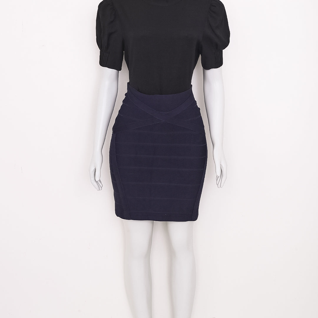 Detalhes: Saia Hervé Leger azul marinho no tamanho p. A peça é mas colada ao corpo e possui um material bem elástico.