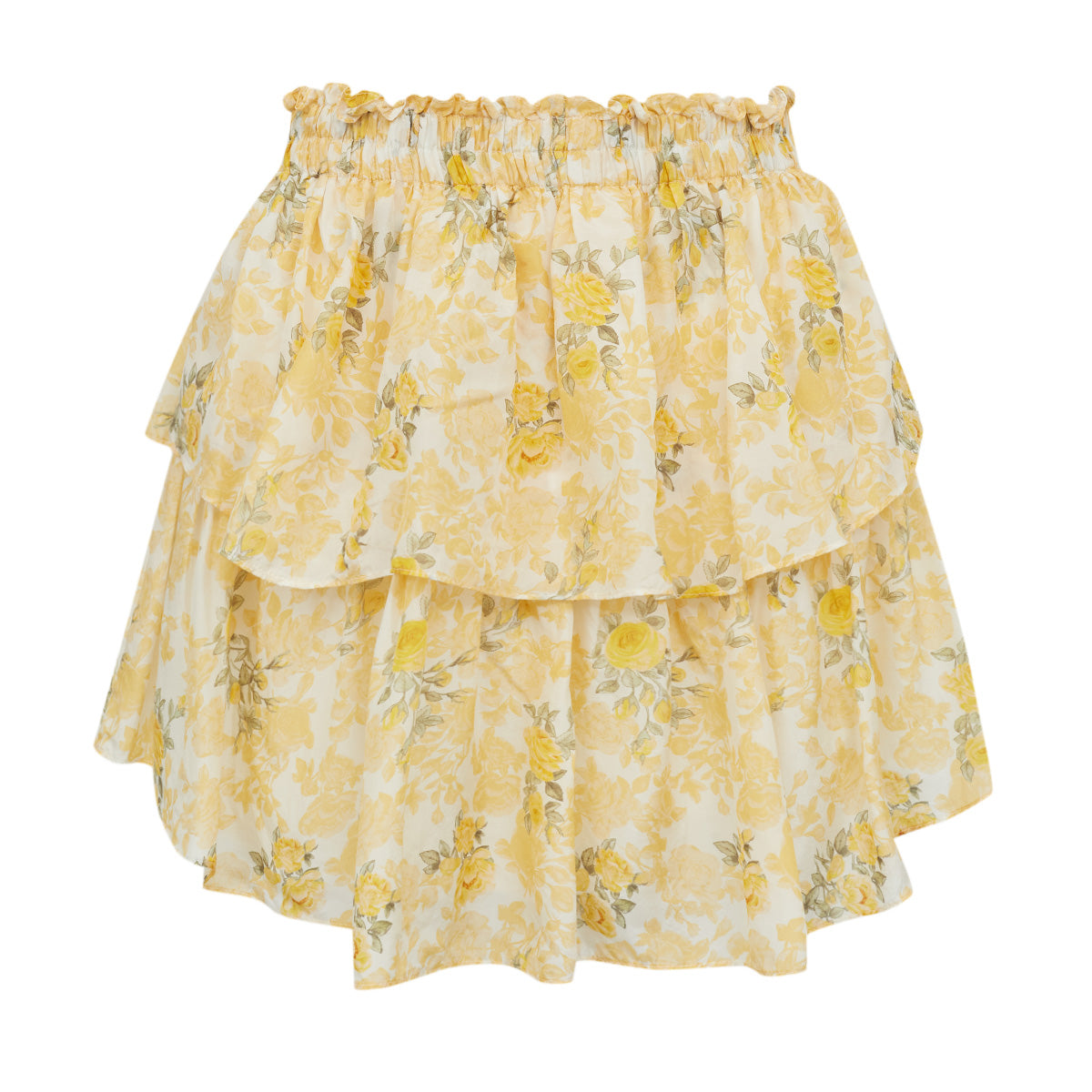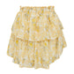 Detalhes: Saia Love Shack Fancy, possui modelagem curta e babados. Estampa floral amarela e elástico na cintura.