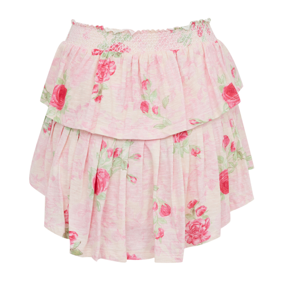 Detalhes: Saia Love Shack Fancy, possui modelagem curta e babados. Estampa floral rosa e elástico na cintura.