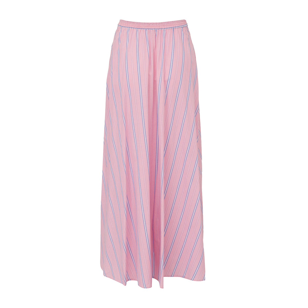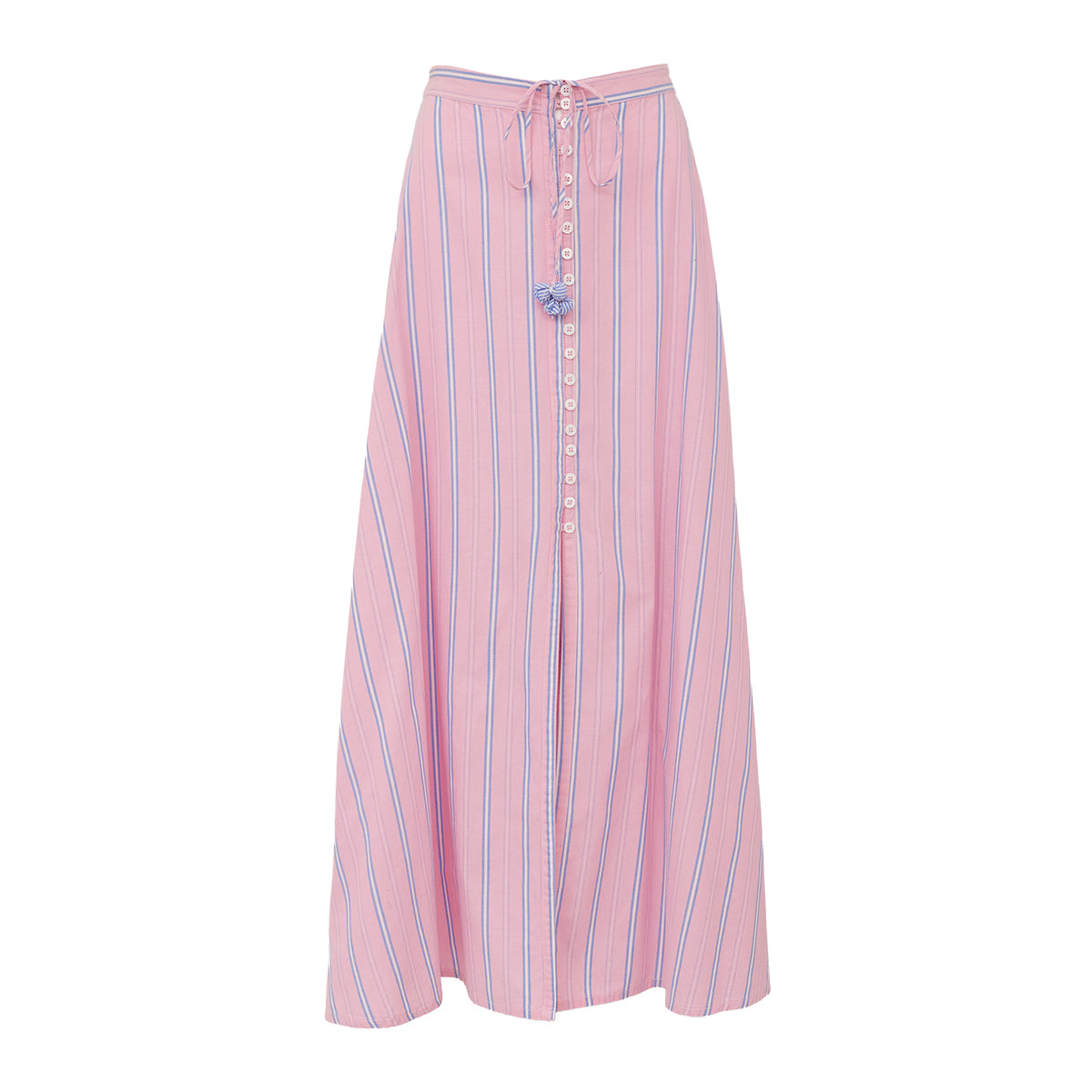 Detalhe: Saia Mariana Penteado confeccionada em algodão na cor rosa e azul. Modelo possui comprimento longo, cintura com cordão e elástico , abertura frontal. Fechamento por Botões.