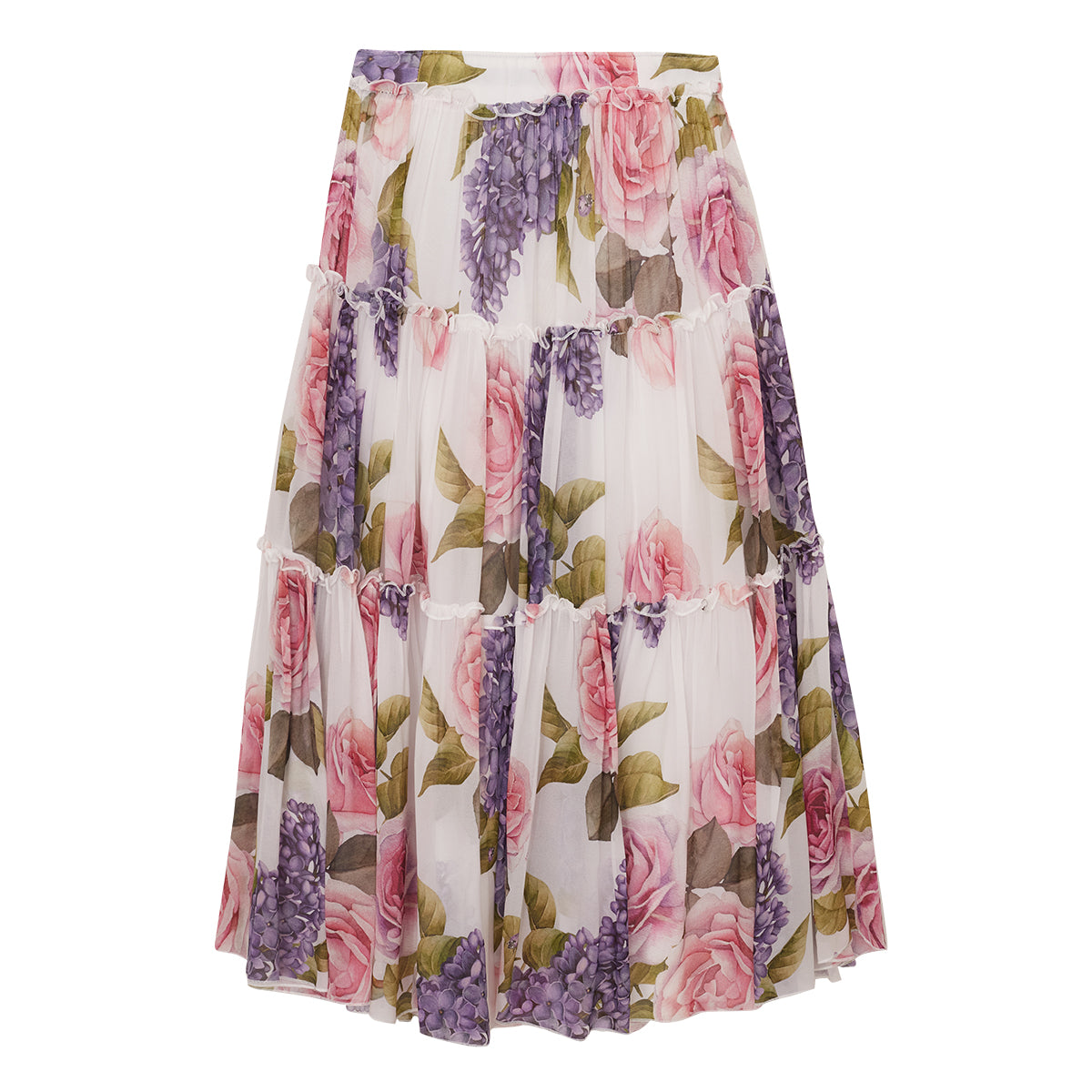 Detalhes: Saia Monnalisa confeccionado em viscose branca com estampada de flores coloridas. Modelo possui modelagem ampla, comprimento longo, cós pequeno com pregas e mini babados. Acompanha forro fixo em algodão branco. Fechamento em zíper posterior.