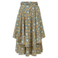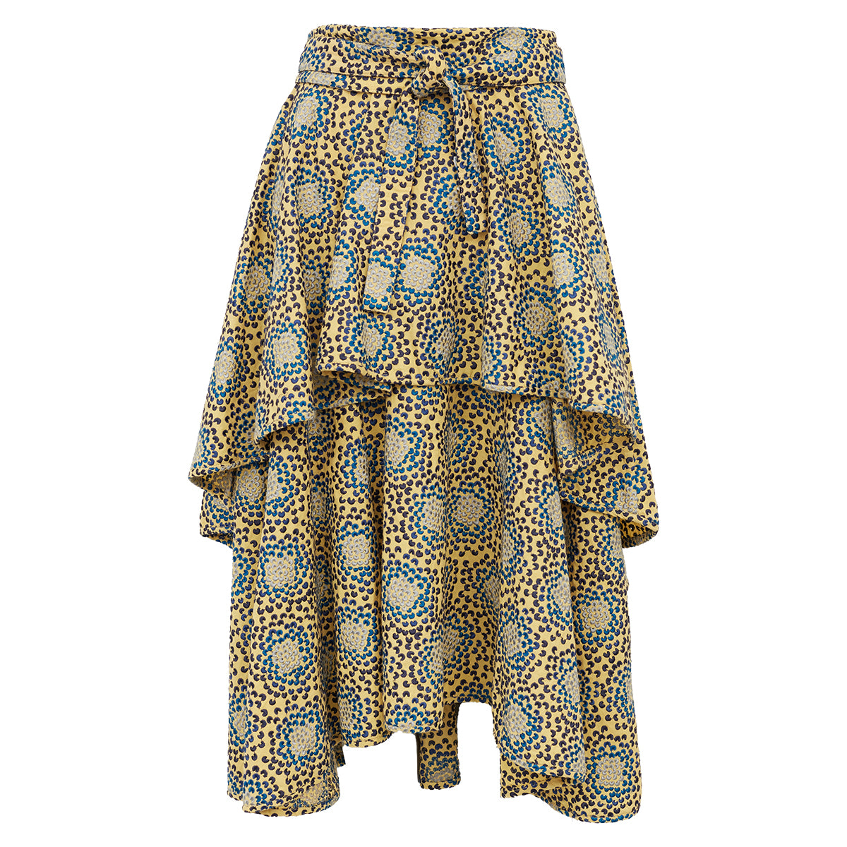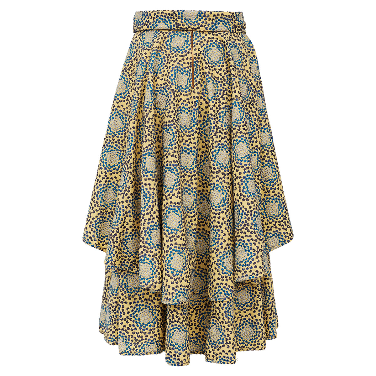 Detalhes: Saia Paula Raia Amarela com bordados azuis. Possui modelagem evasê com babados assimétricos, cós reto e fechamento com zíper invisível posterior. Acompanha cinto faixa na mesma padronagem.