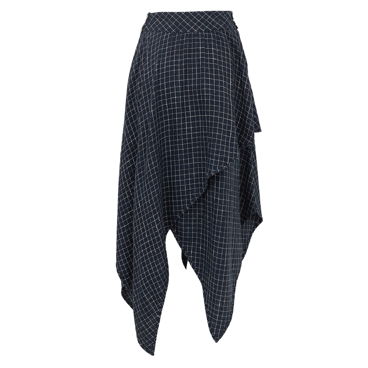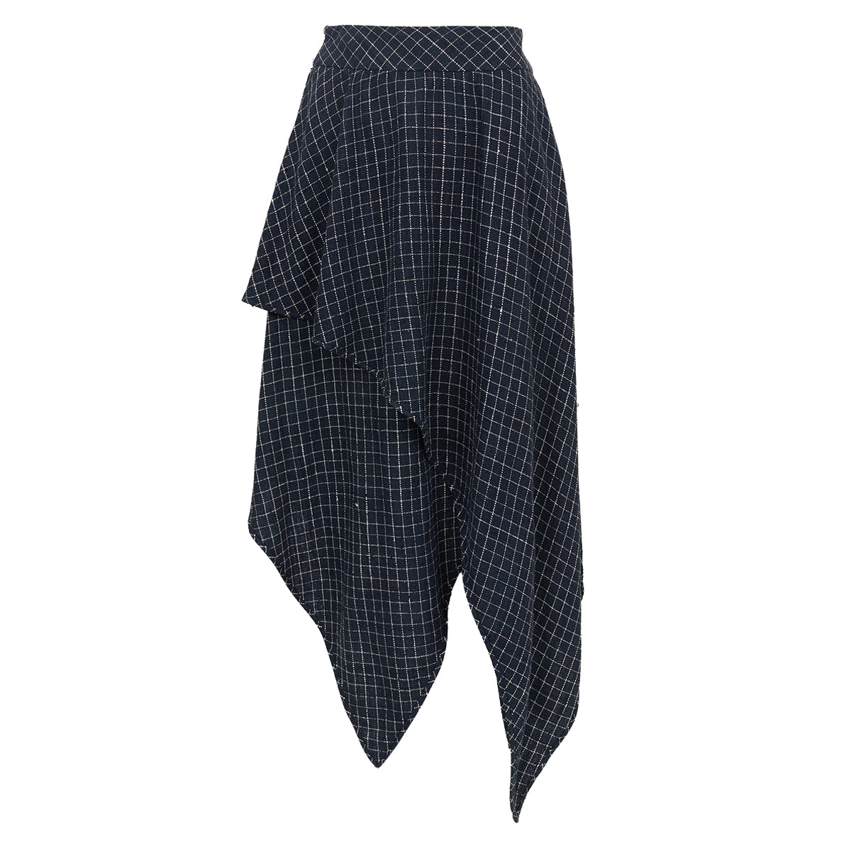 Detalhes: Saia Paula Raia assimétrica na cor azul marinho em tecido entrelaçado com pespontos brancos. Possui modelagem evasê com partes laterais maiores e comprimento midi. Cós reto e fechamento em zíper invisível e botões aplicados na parte lateral.