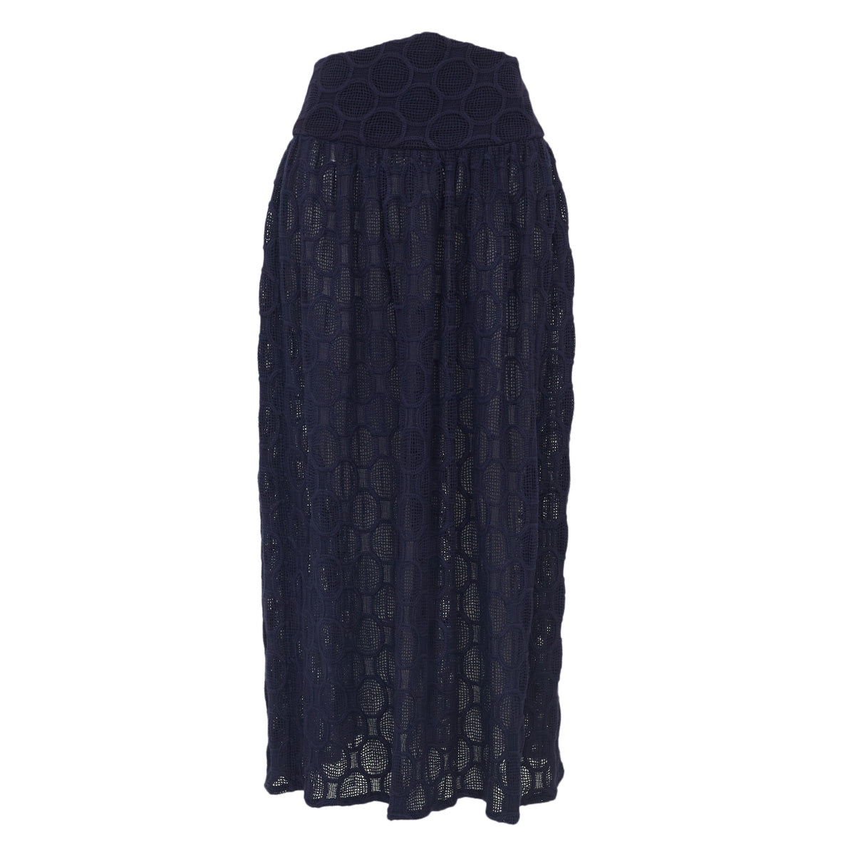Detalhes: Saia Paula Raia confeccionada em renda azul marinho, com transparência. Modelo possui comprimento midi, e cós alto. Contém fechamento em zíper traseiro.