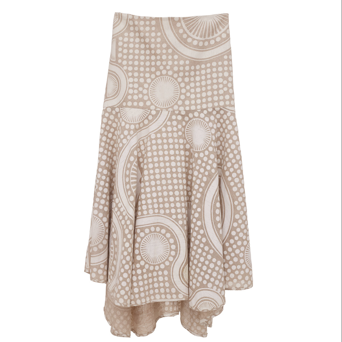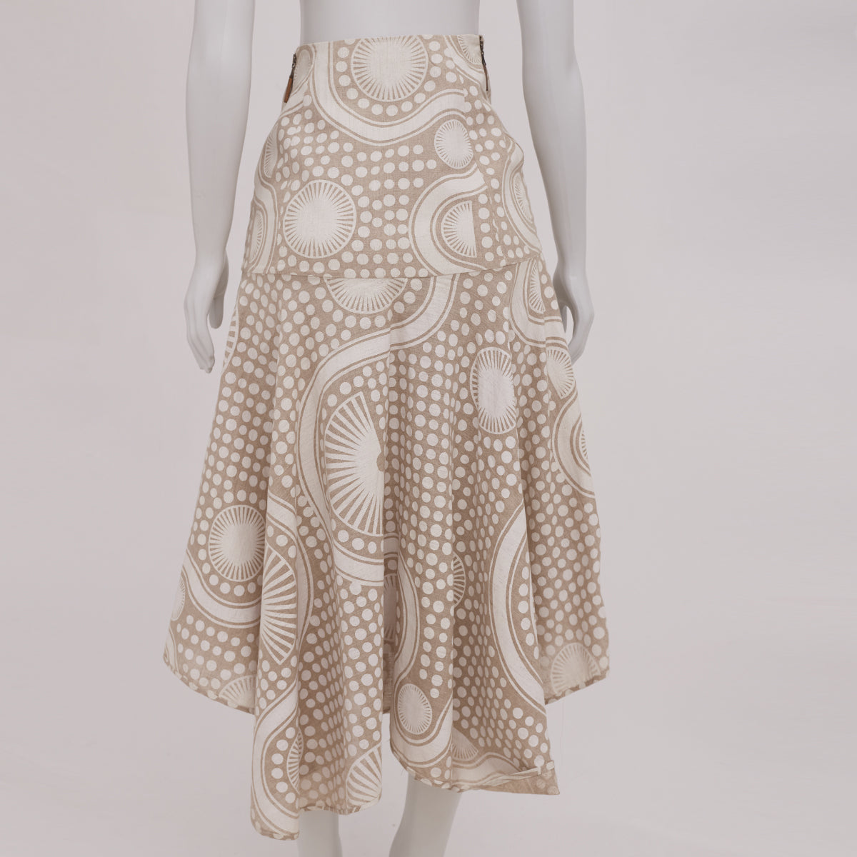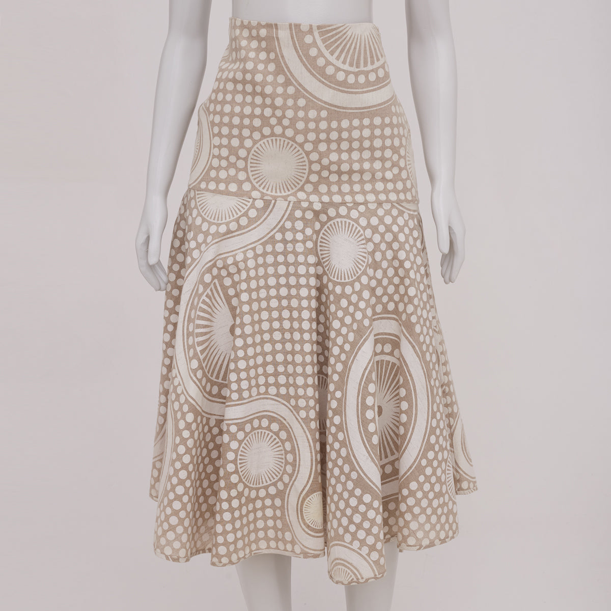 Detalhes: Modelo confeccionado em linho bege. Possui comprimento midi, detalhe de estampas em tons de branco e zíper nas laterais.