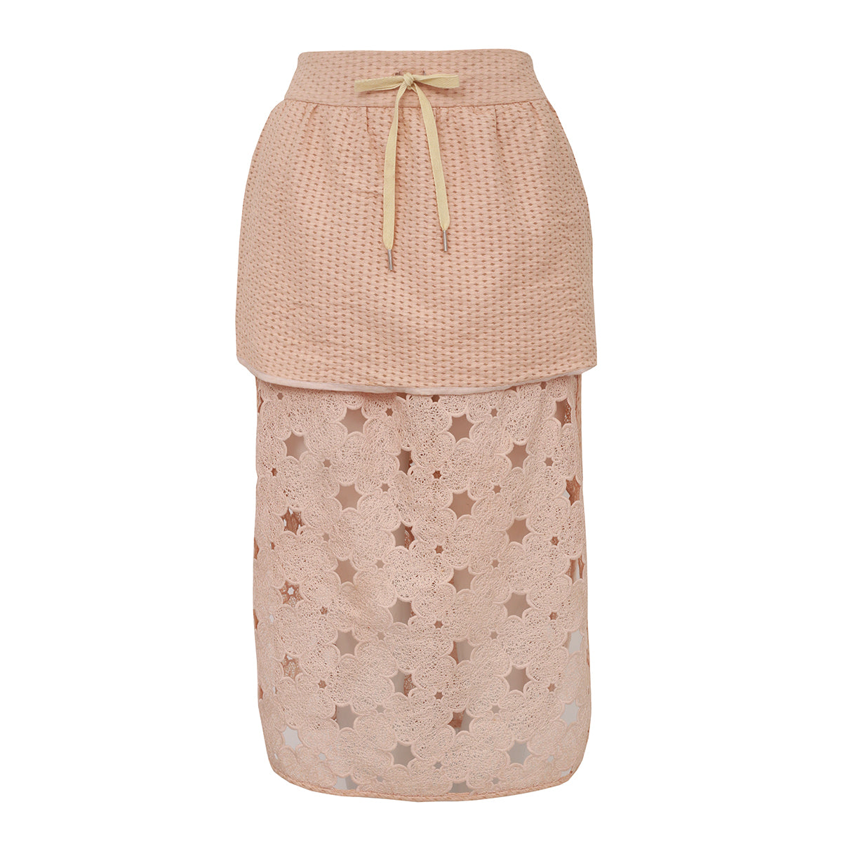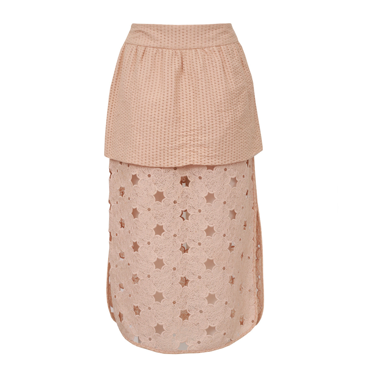 Detalhes: Saia Paula Raia confeccionada em algodão e poliéster na cor bege. Apresenta comprimento midi, saia de renda vazada com fenda atrás e uma saia sobreposta com forro. Fecho por dois zíper laterais, um de cada lado e possui detalhe em amarração