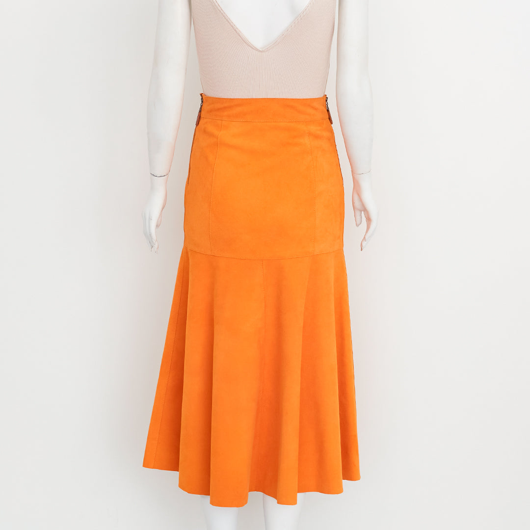 Detalhes: Saia confeccionada em couro suede e couro algodão na cor mostarda. Possui modelagem evasê, comprimento midi, cós reto, bolsos frontais com ziper e fechamento por dois ziperes laterais.