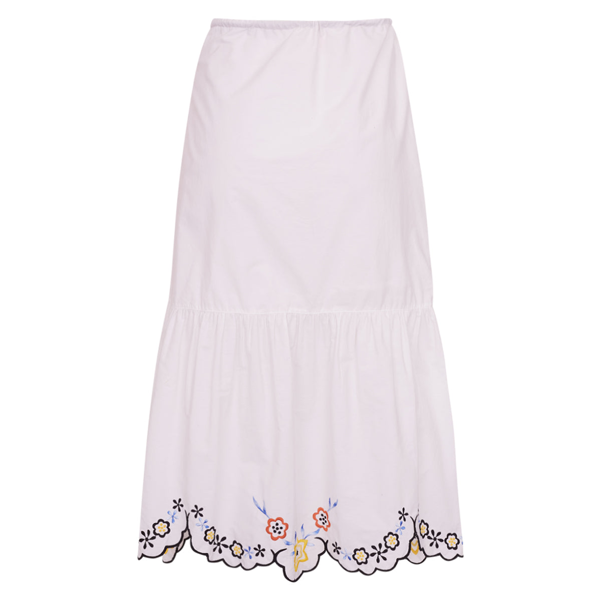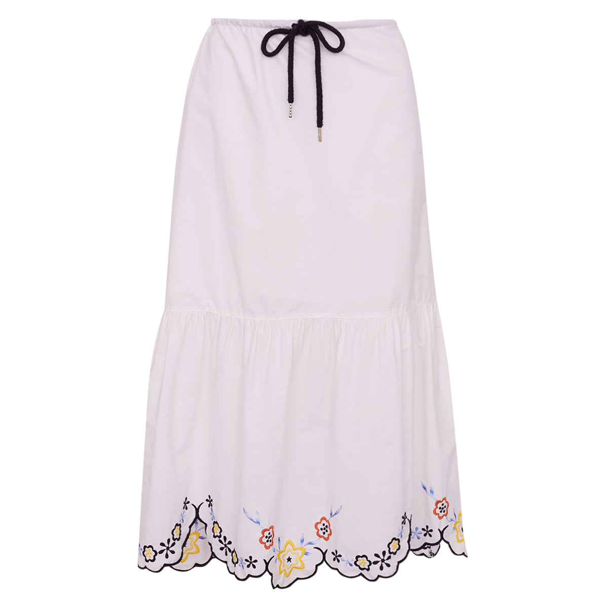 Detalhes: Modelo possui comprimento midi, caimento rodado com babados, e detalhe em bordados na parte da barra. Contém forro, e ajuste na cintura em cordão preto.