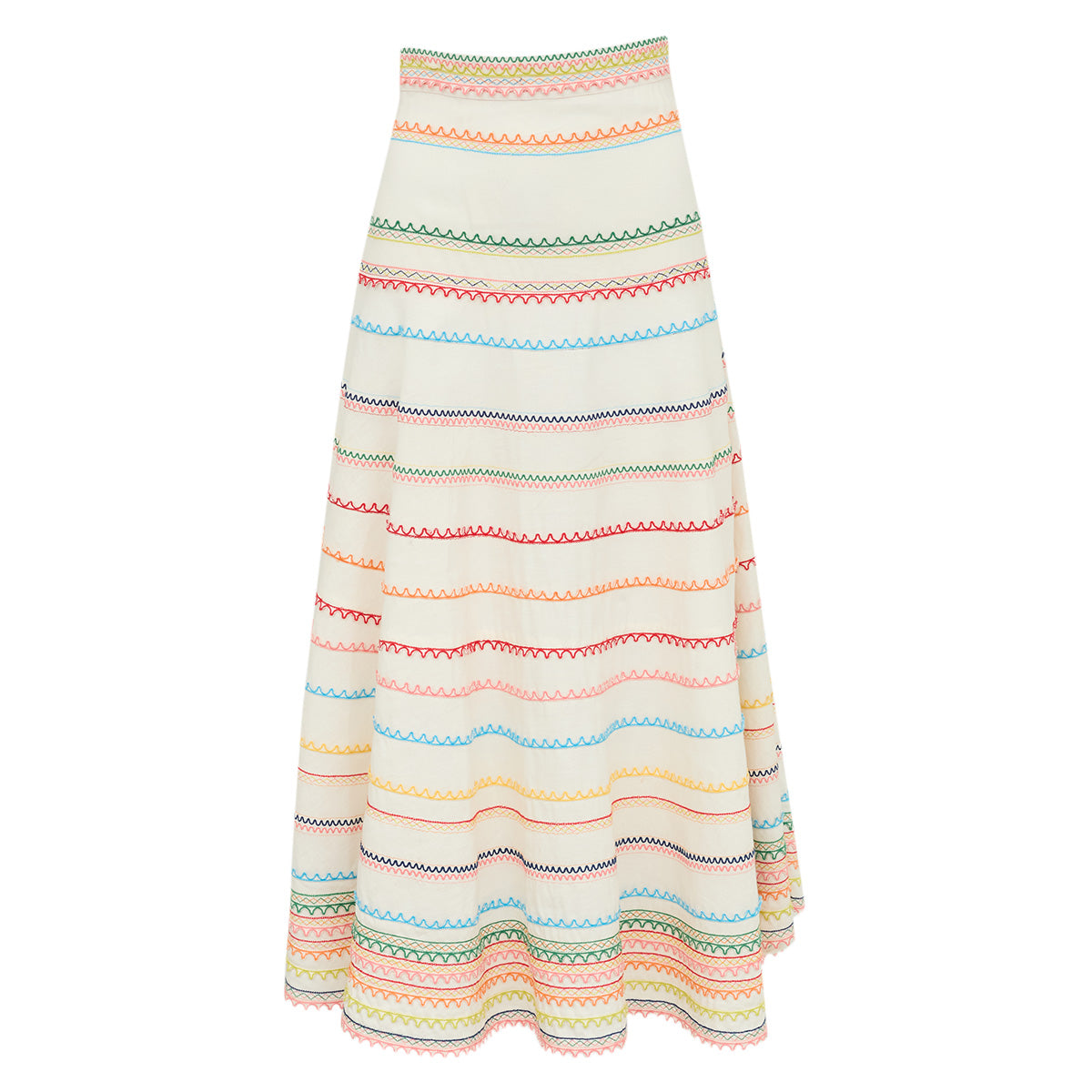 Detalhes: Saia Zimmerman branca, possui bordados coloridos em azul, salmão, verde e laranja. Possui modelagem godê midi e zíper lateral