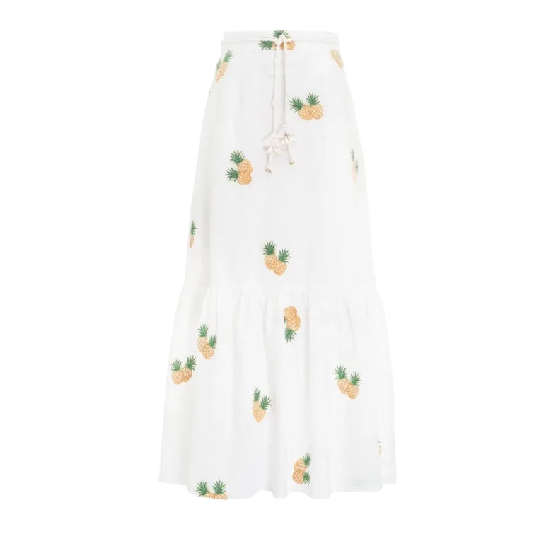 Detalhes: Saia zimmerman confeccionada em tecido na cor branca, apresenta um desing rodado com estampa de abacaxi. Possui forro na parte interna e fechamento na parte de trás da peça. Acompanha cinto com detalhe em conchas.