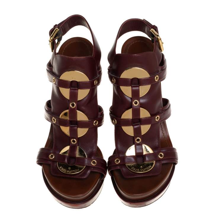 Detalhes: Sandalia de salto Louis Vuitton confeccionada em couro vinho, com um detalhes em ferragens dourado. Eles apresentam um design com tiras de couro, com uma fivela dourada e um salto grosso e escultural.
