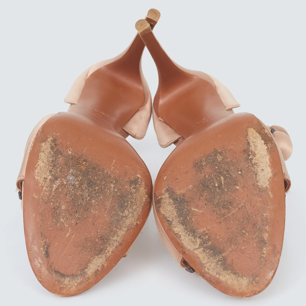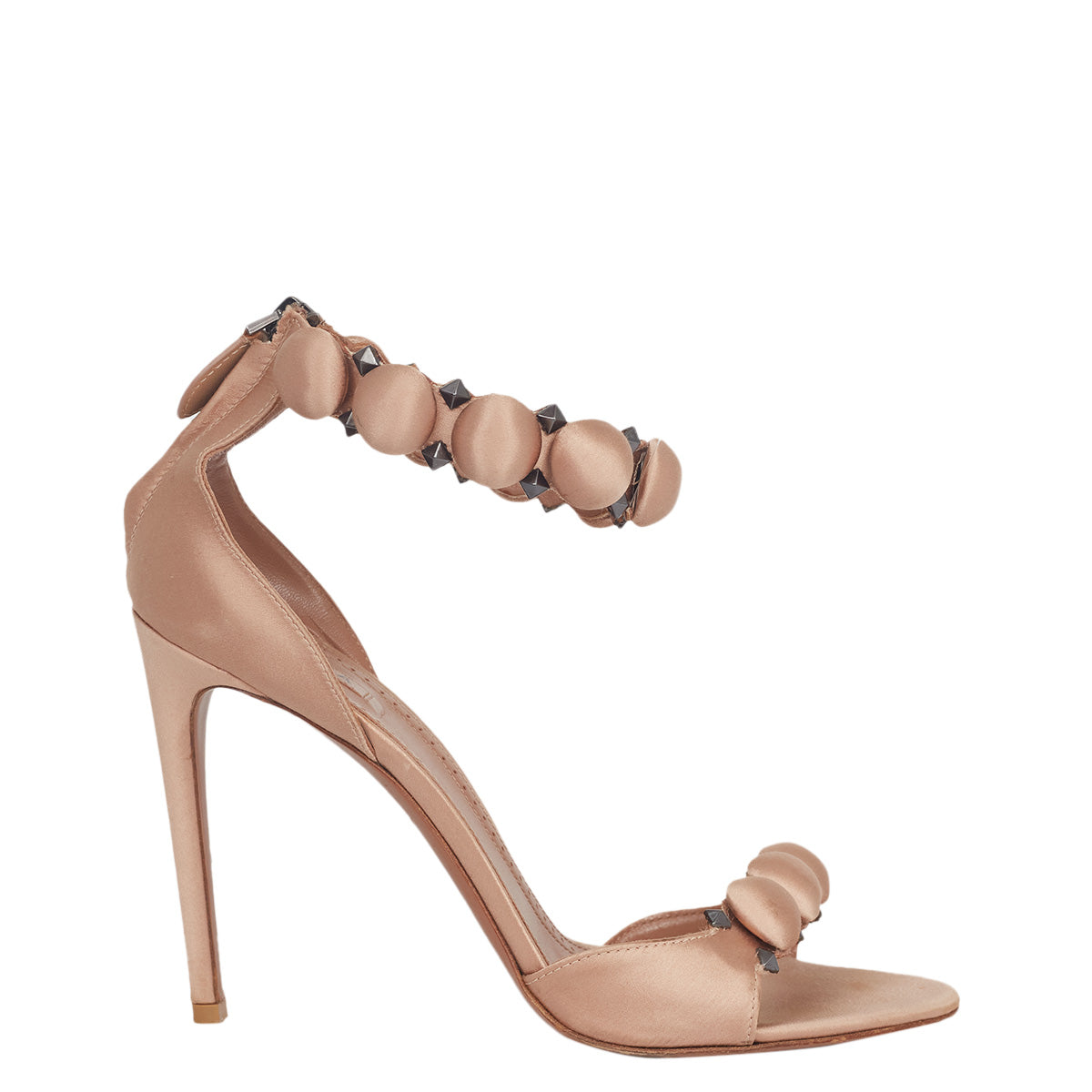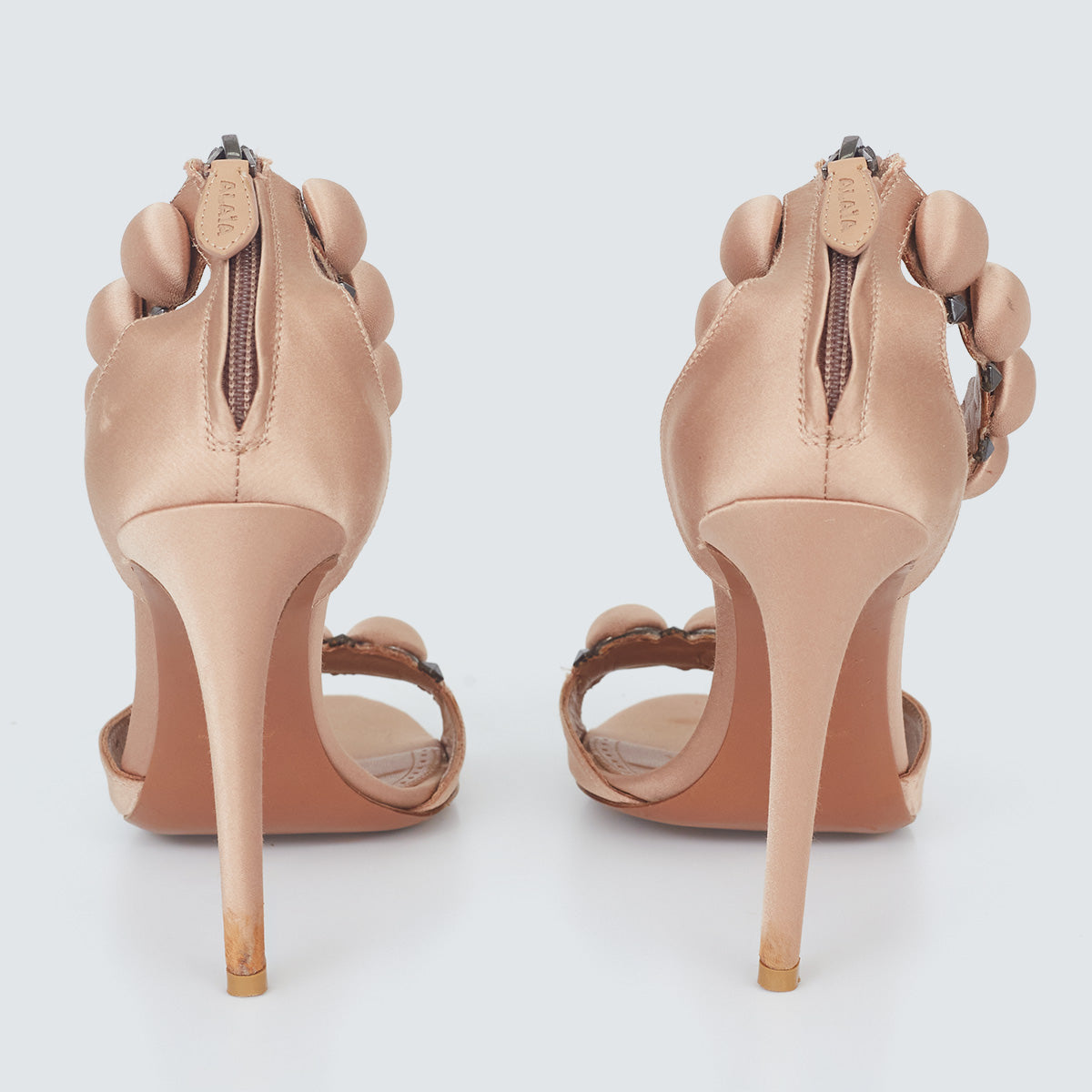 Detalhes: Sandália Alaia confeccionada em couro na cor champanhe. Modelo possui salto alto fino, duas tiras com detalhe em esferas e studs, parte posterior fechada e fechamento por zíper.
