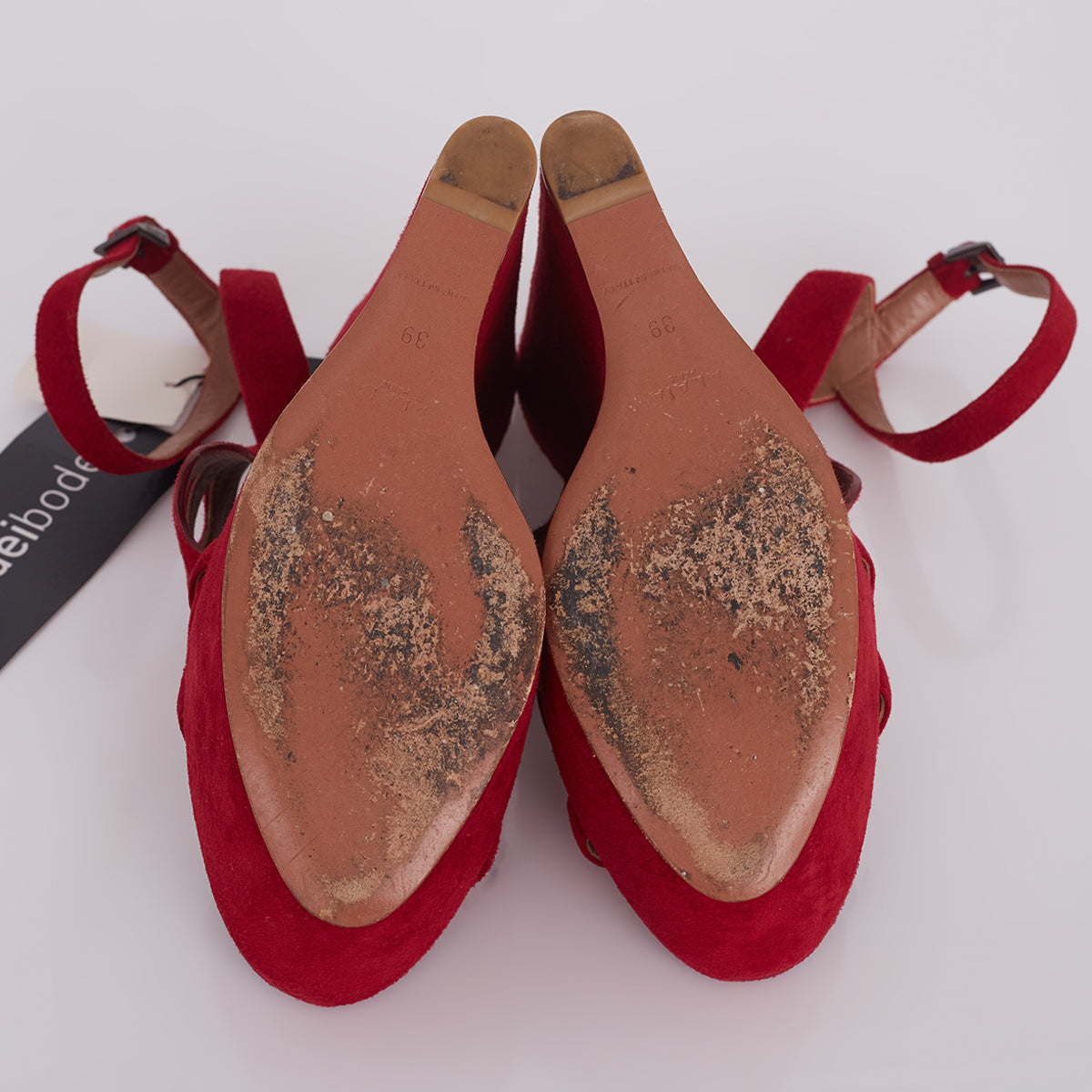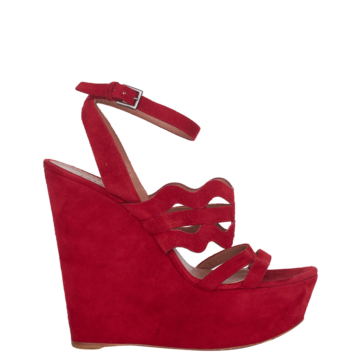 Detalhes: Sandália Alaia confeccionada em suede na cor vermelha. Possui modelo anabela, salto plataforma. duas tiras frontais, três tiras no peito e duas delas sendo em ondas, apoio em suede nas laterais e calcanhar aberto. Fechamento em fivela ajustável no tornozelo.