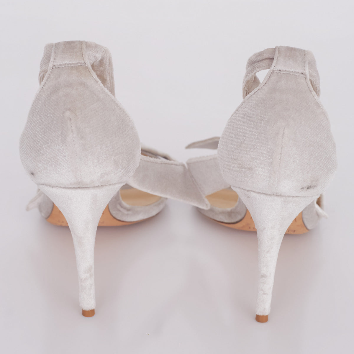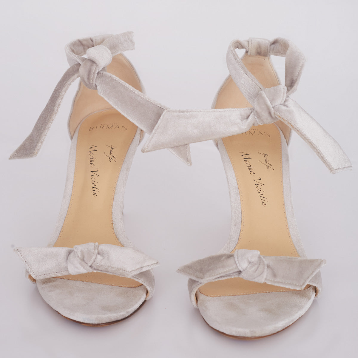 Detalhes: Sandália Alexandre Birman cinza em veludo. Modelo clássico, de amarrar no calcanhar e com laço na região dos dedos, possui bico arredondado e salto alto fino.